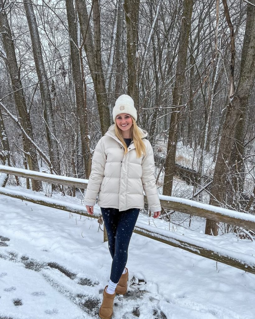 Perfect for winter wear women who live in leggings all season. This look works beautifully for school drop-offs, casual workouts, or a snowy morning walk. To add personality, opt for a wool baseball cap or winter hats for women in muted tones. The monochrome palette already feels structured, so avoid brightly colored accessories. This is a great example of dressing warm for winter without feeling bulky.