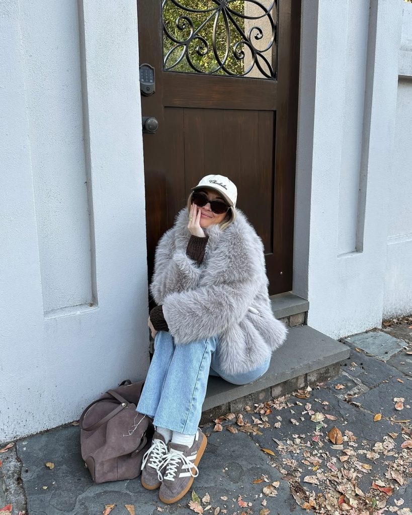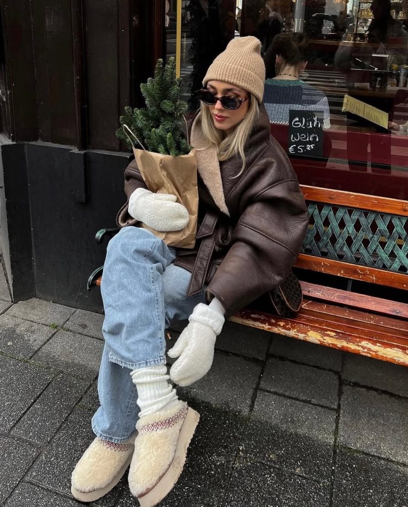 This look captures the essence of errand-day warmth—comfortable denim, oversized shearling, and mittens that keep the hands toasty even on brisk mornings. It’s relaxed, approachable, and wonderfully winter-ready.