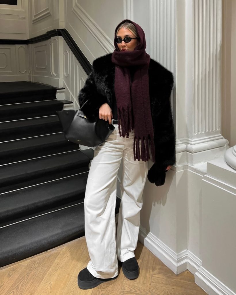 Ideal for indoor gatherings, movie nights, or heading out for errands on milder days. A cream scarf could brighten the palette further. Avoid heavy boots; the fur jacket already provides visual weight. This outfit is perfect for those who love aesthetic winter styling that doesn’t feel overdone.