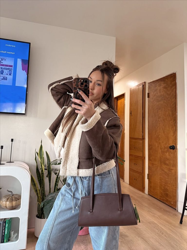 A relaxed yet polished take on street style, this look blends a cropped brown shearling jacket with slouchy denim, creating an outfit that works for women balancing warmth and casual comfort.