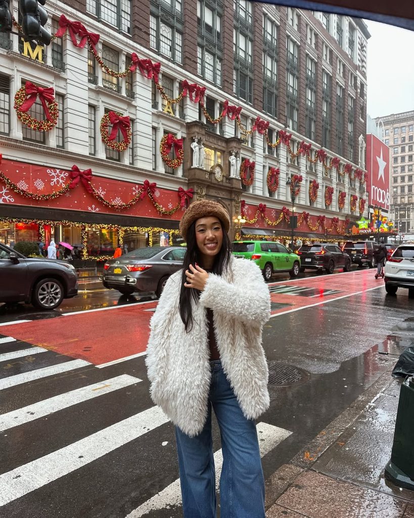 This look captures the joy of a winter day in the city—holiday decorations overhead, soft flakes in the air, and an outfit built to balance warmth with cheerful energy.