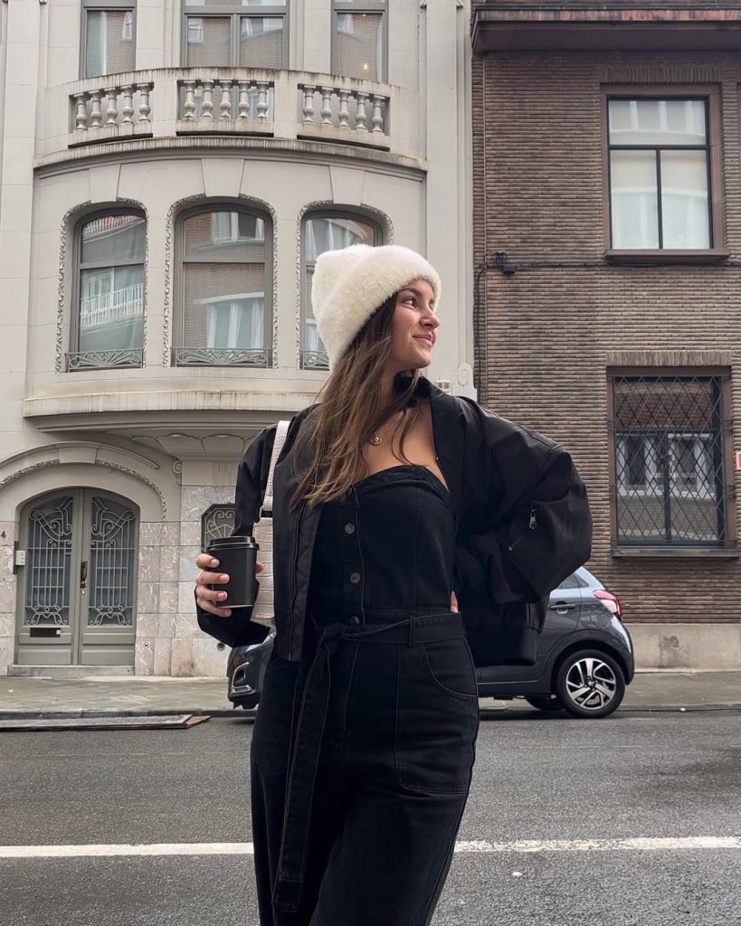 A chic, urban blend of black tones softened by a fluffy white beanie—this look feels modern, wearable, and ideal for mild winter days.