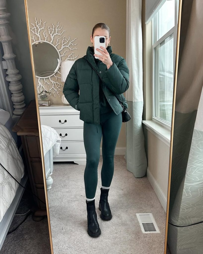 A monochrome forest-green set paired with a puffer jacket creates a sporty, streamlined cold-weather look—functional enough for errands, polished enough for brunch.