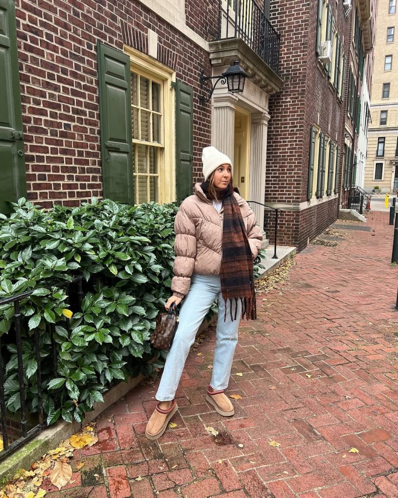 A puffer jacket in a warm beige tone paired with light denim and a plaid scarf creates a relaxed, city-friendly look that blends aesthetic charm with practical comfort.