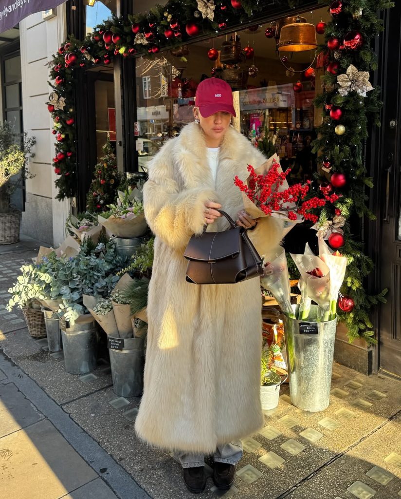 This outfit captures the charm of a holiday market morning—arms full of fresh berries, surrounded by greenery, wrapped in a coat that feels like wearing a cloud. It’s warm, maximalist, and effortlessly chic.