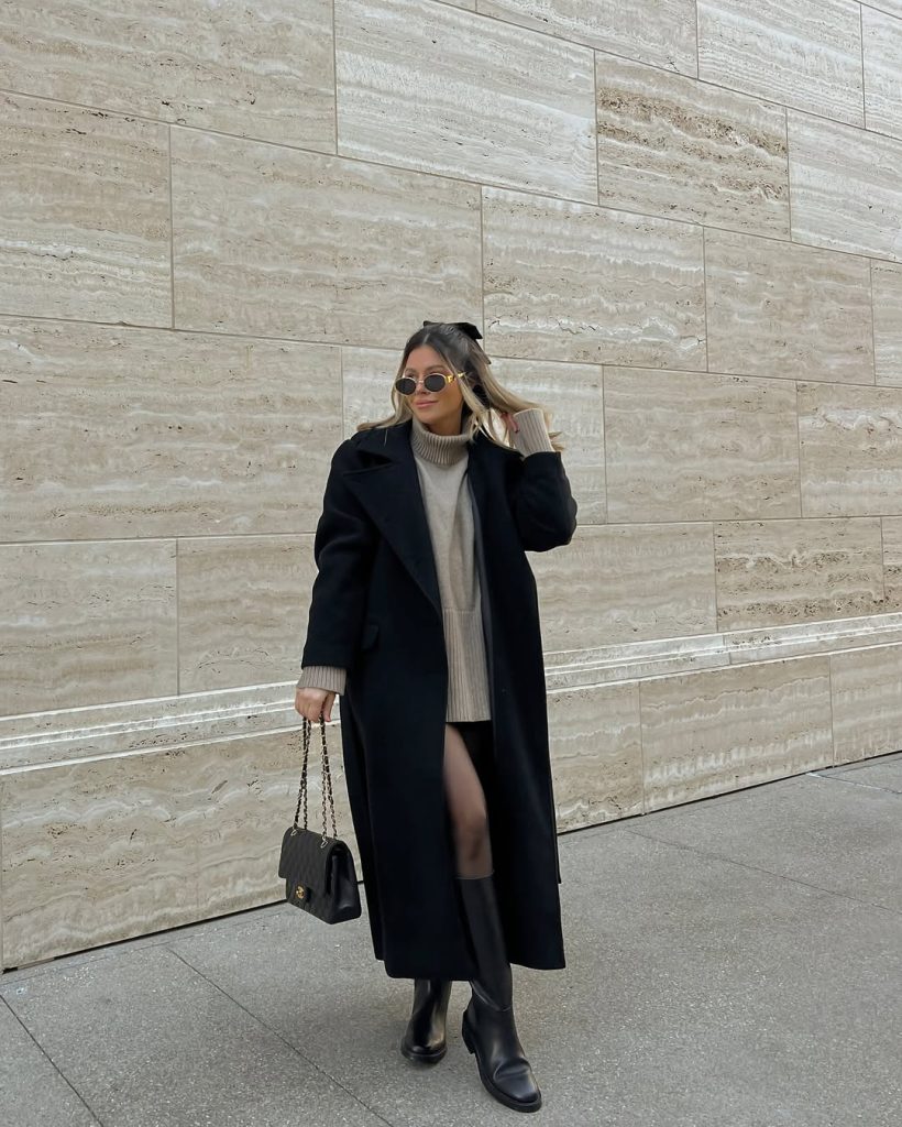 This refined combination embodies dressing warm for winter without relying on bulky pieces. Ideal for office commutes, downtown brunches, or gallery nights. To add personality, incorporate a patterned silk scarf or statement earrings. Avoid overly colorful bags—the neutral palette is key to its elegant street style appeal. A great pick for readers looking to wear dresses in winter with long coats that instantly elevate the silhouette.