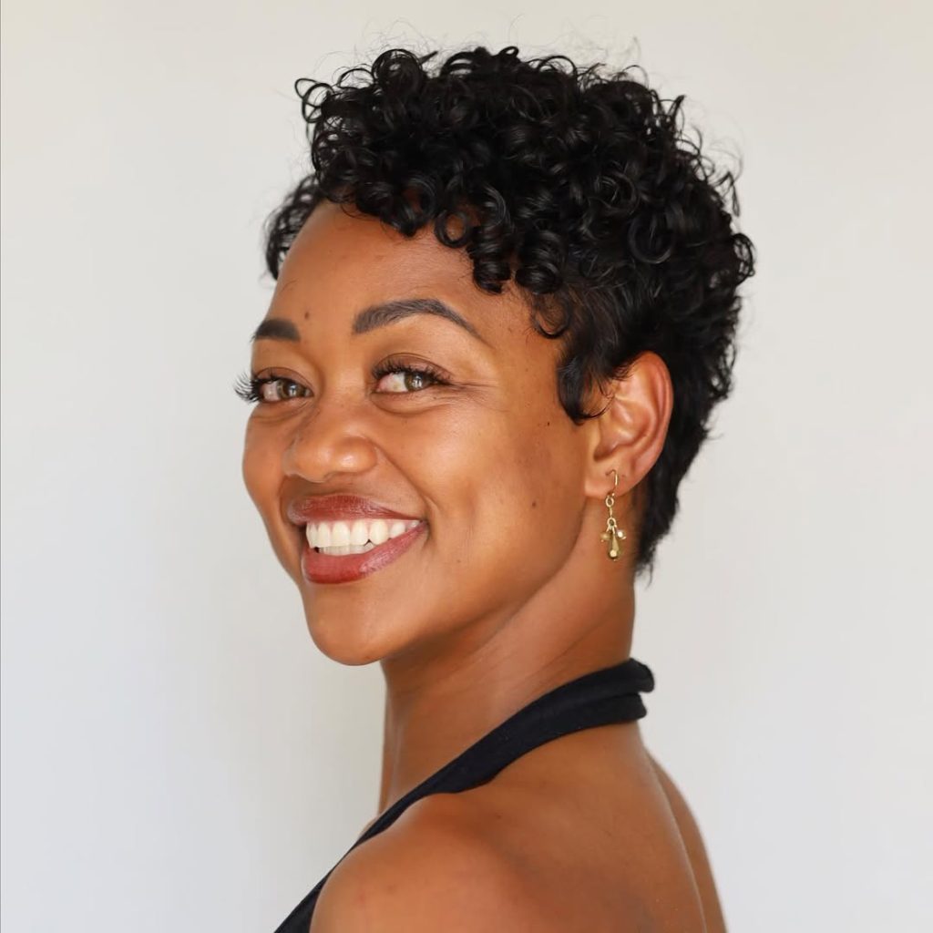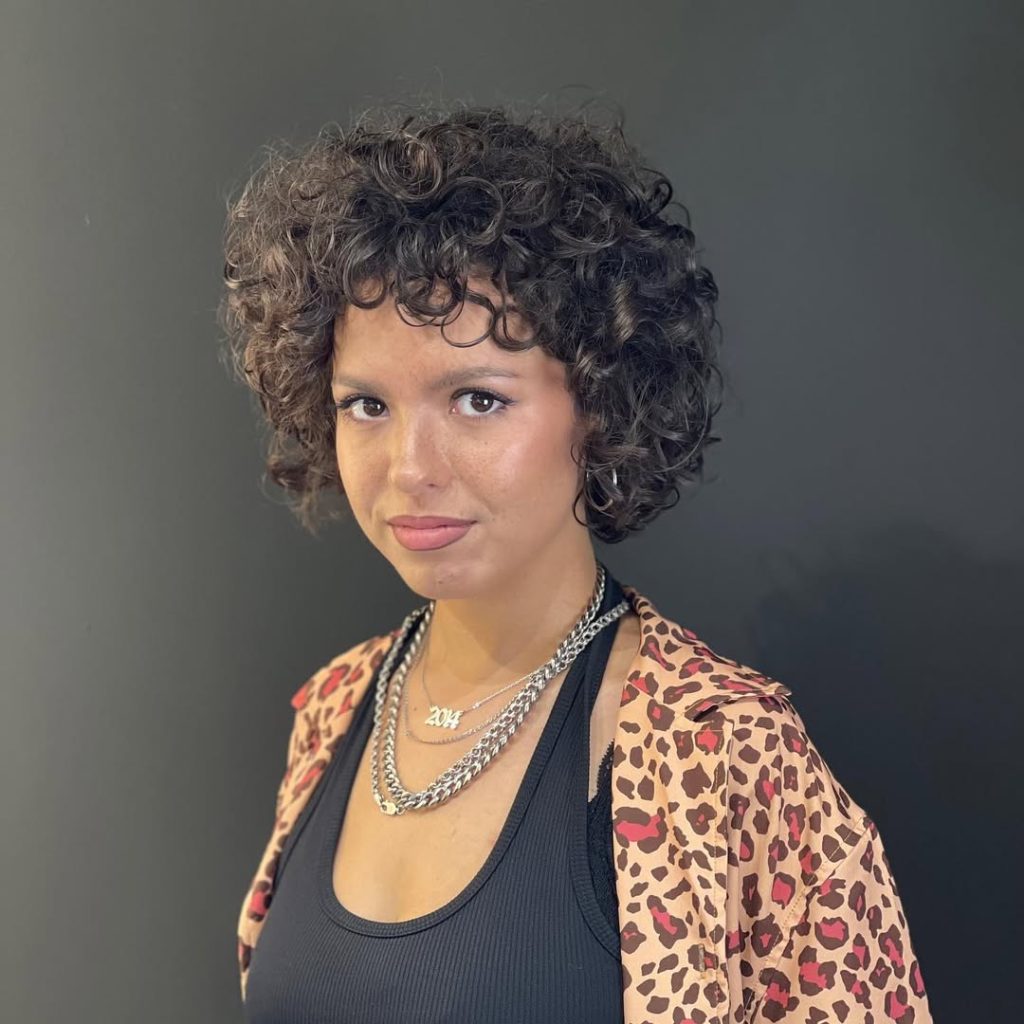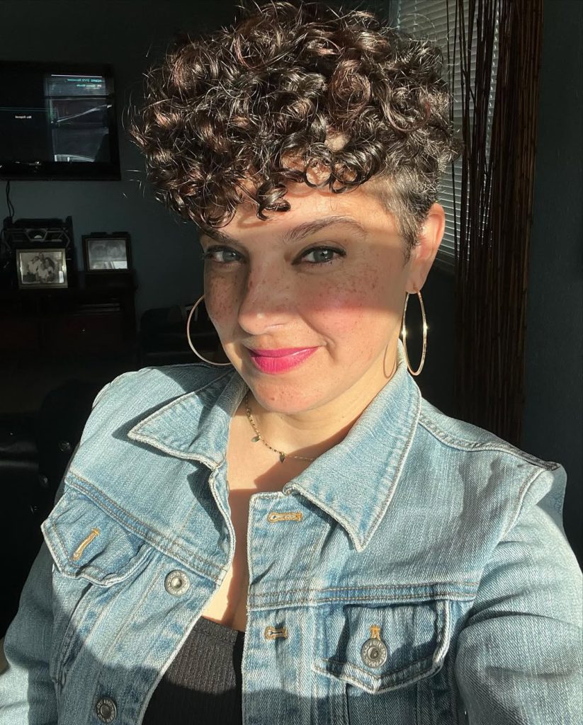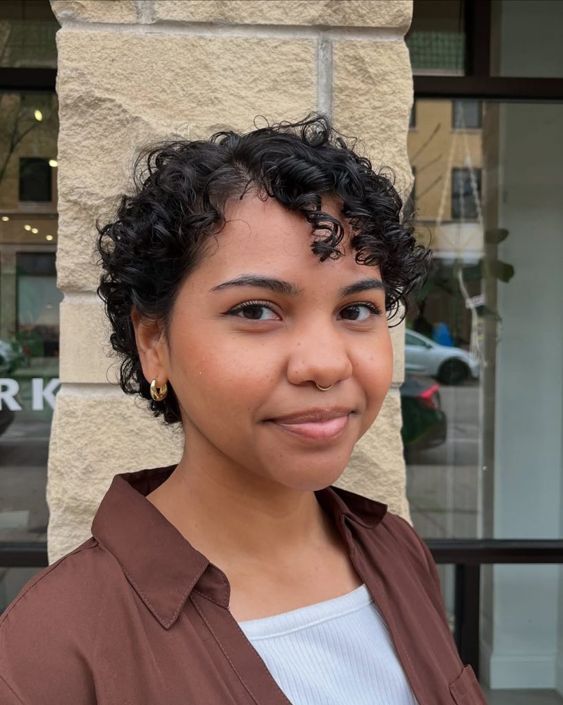 With its full, fluffy texture and face-framing bangs, this curly pixie is full of life. It gives off a glamorous, almost retro feel that feels straight out of the 90s while still feeling modern. The volume around the crown makes the style playful and bold, drawing attention to the eyes.