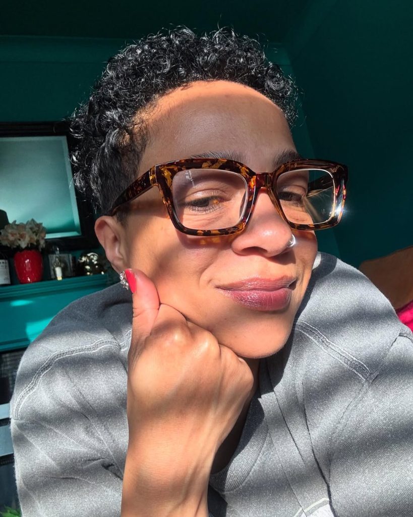 This sleek, glossy pixie with tight curls feels fresh and modern, especially when paired with bold glasses and minimal makeup. It radiates intelligence and self-assurance, giving the impression of someone who’s stylish but also loves practicality. It’s a look that shines in natural light, making everyday moments feel chic.