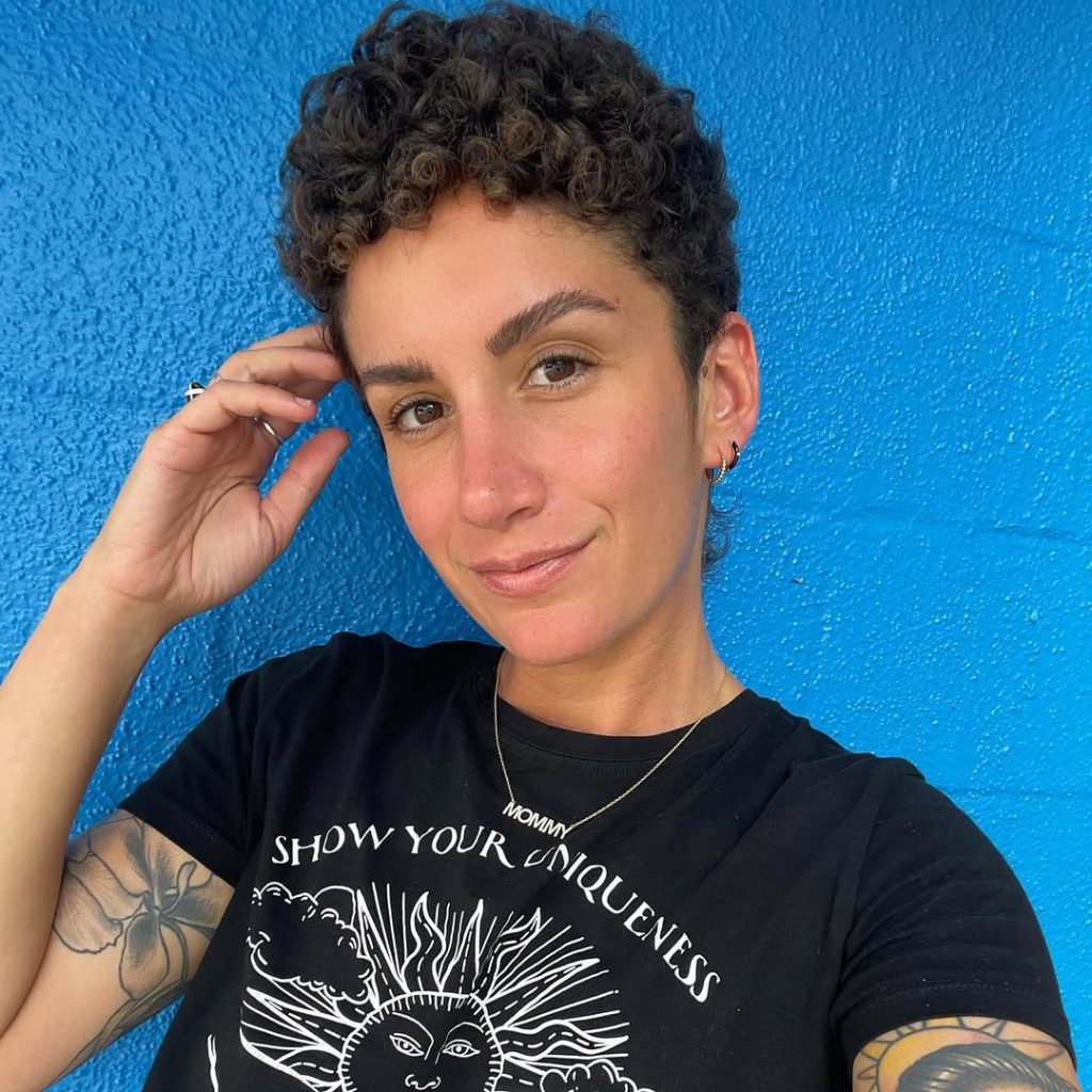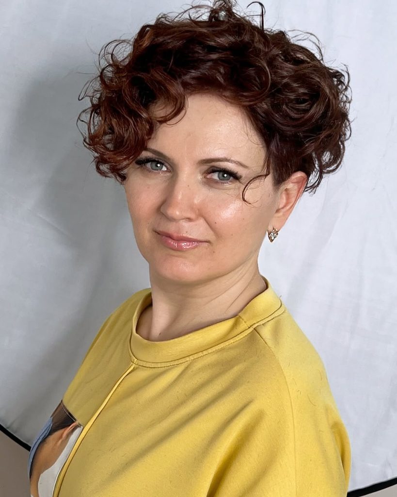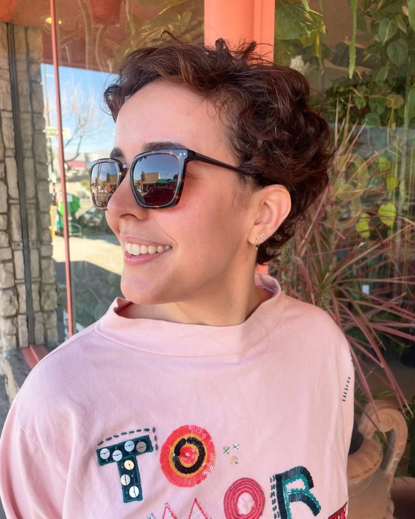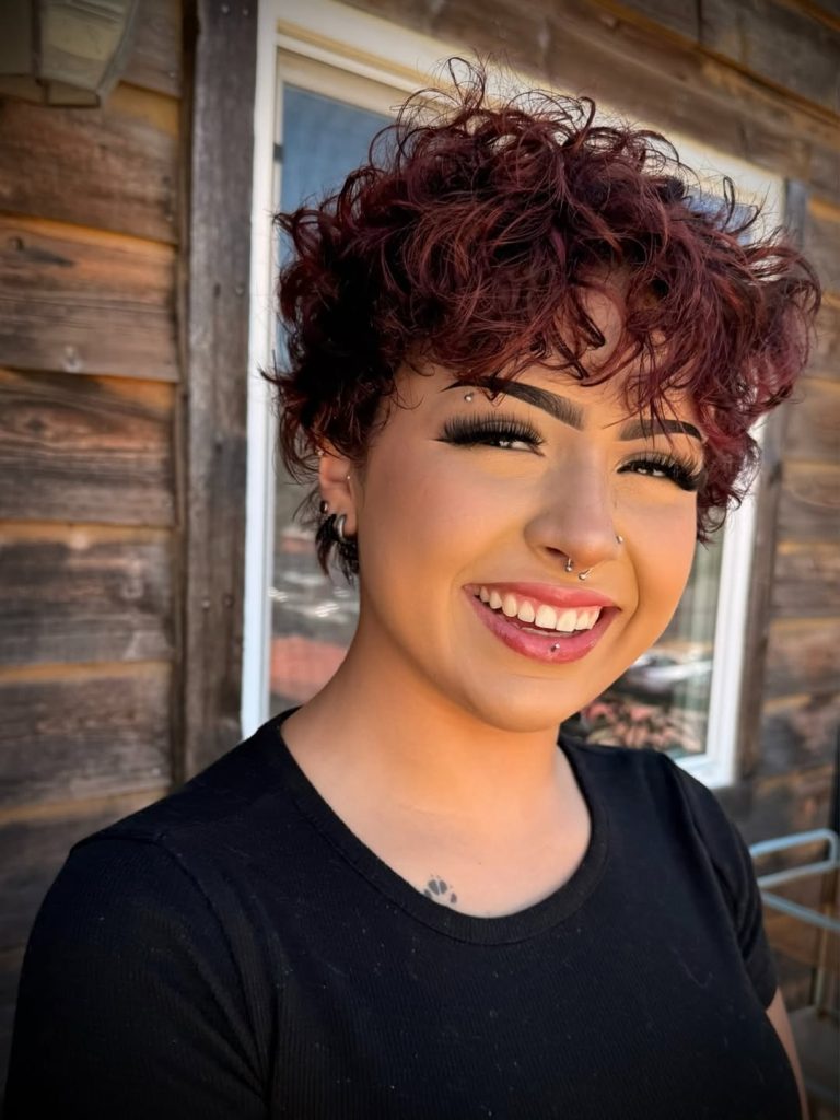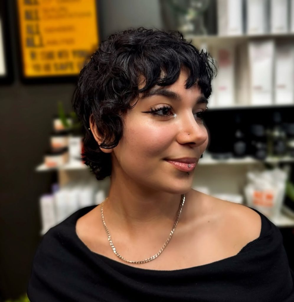 This curly pixie channels shag inspiration, with slightly longer layers creating playful movement around the crown. The micro bangs add a touch of edge while the soft texture keeps it feminine and approachable. It’s a style that feels artsy and modern at once.