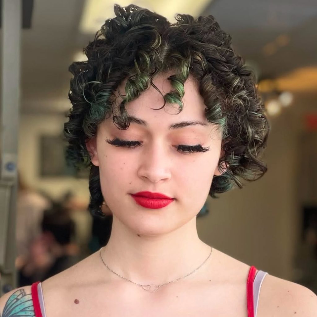 The subtle green highlights peeking through the spirals make this curly pixie playful and artistic. The curls are defined but bouncy, softly framing the face and giving the entire style a creative and expressive edge. The look feels striking and full of character when combined with a bold red lip.