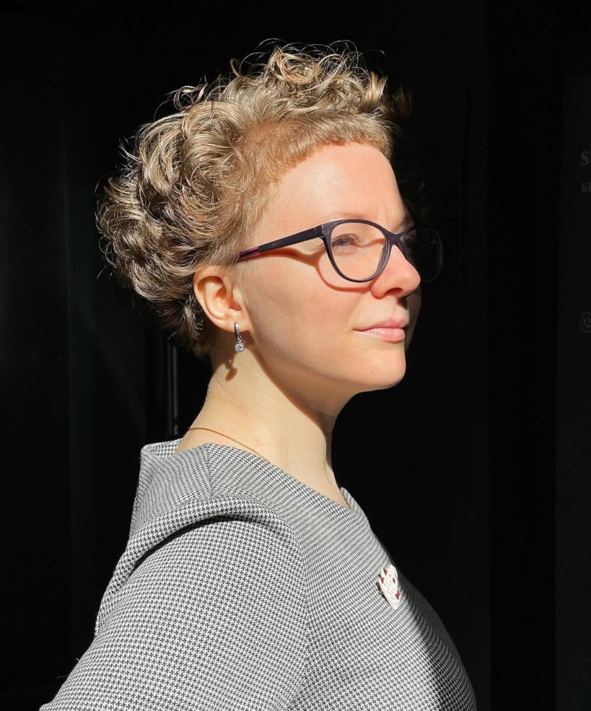 Blonde highlights add brightness and contrast to this curly pixie, giving it a lively, youthful energy. The curls catch the light beautifully, making the cut look textured and full of personality. Paired with glasses and simple styling, it feels smart, confident, and fun.