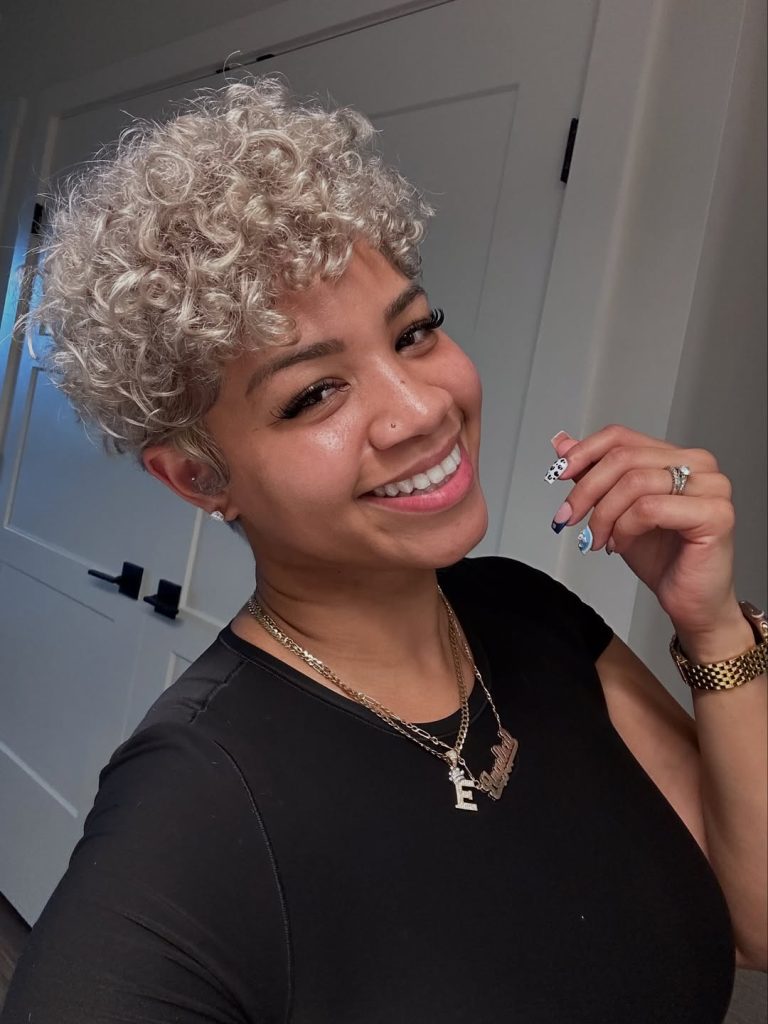The vibe of this cut is undeniably chic. Blonde dye on short curls creates a striking contrast that feels fashion-forward without overwhelming the face. It’s best for women ready to embrace color and texture together, and it pairs beautifully with statement earrings and bold makeup for a polished finish.