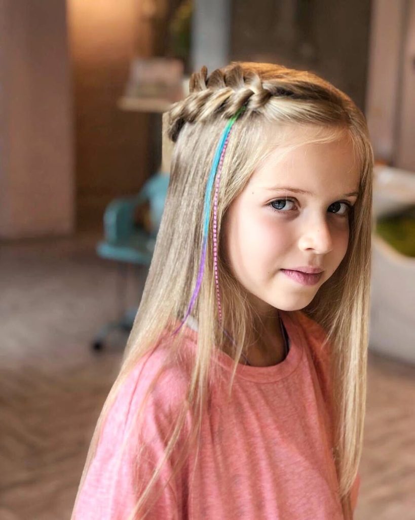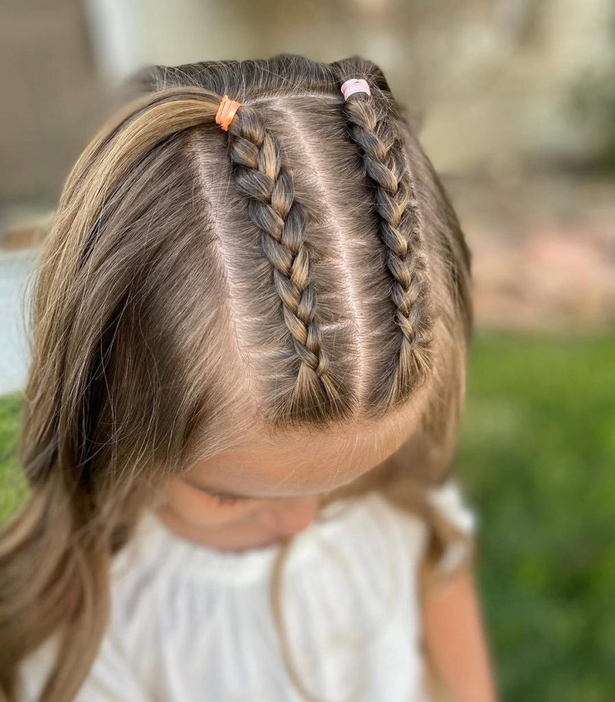 This look works beautifully for girls with thinning or naturally straight hair. The tight braids add structure and visual fullness to natural hair. This style is also easy to recreate on hair that is medium to long in length. Just part the hair cleanly, braid close to the scalp, and secure with soft elastics. It’s ideal if you want something The styling time is short, yet it lasts through church, photos, and backyard play.