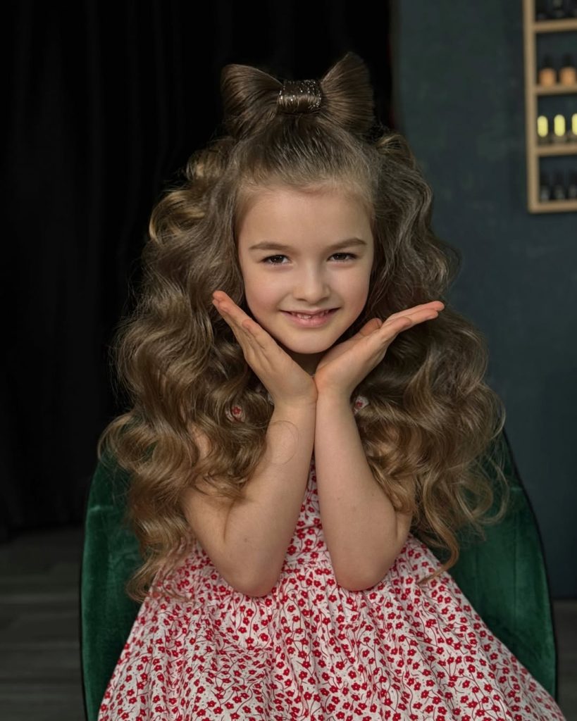 If your child has naturally Curly hair, this style will enhance what she already has. For straighter textures, a large-barrel curling iron can create those soft waves. Gather the top section of hair into a half-up, half-down style and secure it with a statement bow. It’s ideal for special occasions and photographs, offering volume without needing complicated braids or an updo.