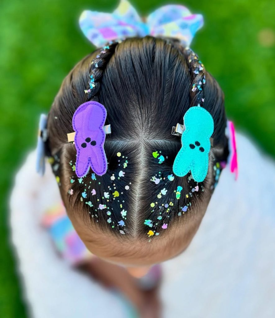 Now this is what I call full-on Easter Fun. The sleek parting, twin ponytails, and colorful glitter details create the cutest effect of bunny ears. It’s bold, festive, and guaranteed to make her the star of the egg hunt. The playful clips and sparkly accents feel like a celebration of spring itself—bright, cheerful, and completely Cute.