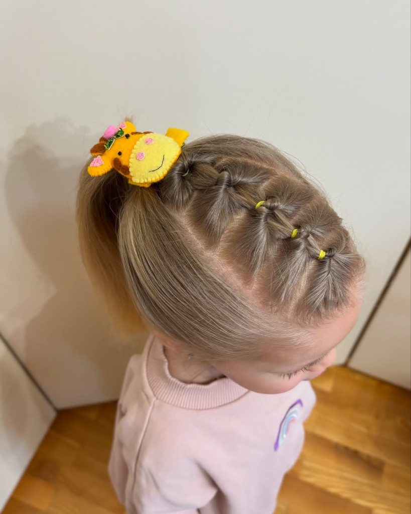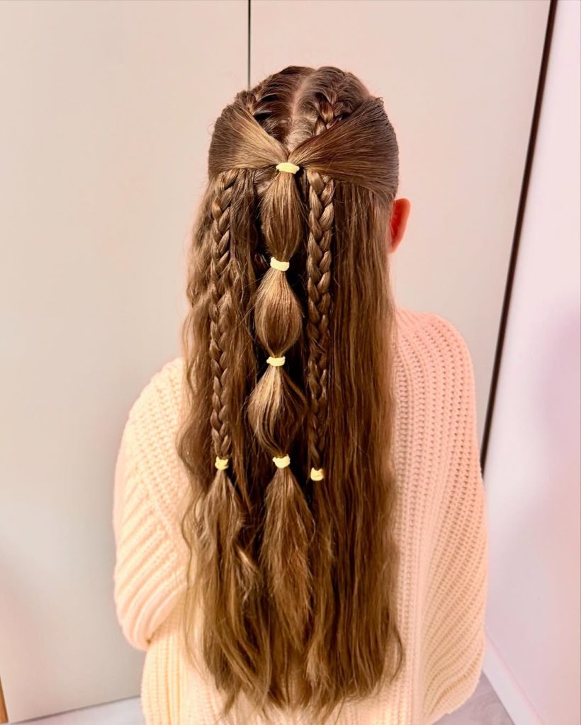 This playful web of sections leading to bubble Ponytails is pure Easter Fun. The colorful elastics add a cheerful touch that feels bright and lively, almost like little spring accents woven through her hair. It’s creative, energetic, and totally Cute without being overly complicated.