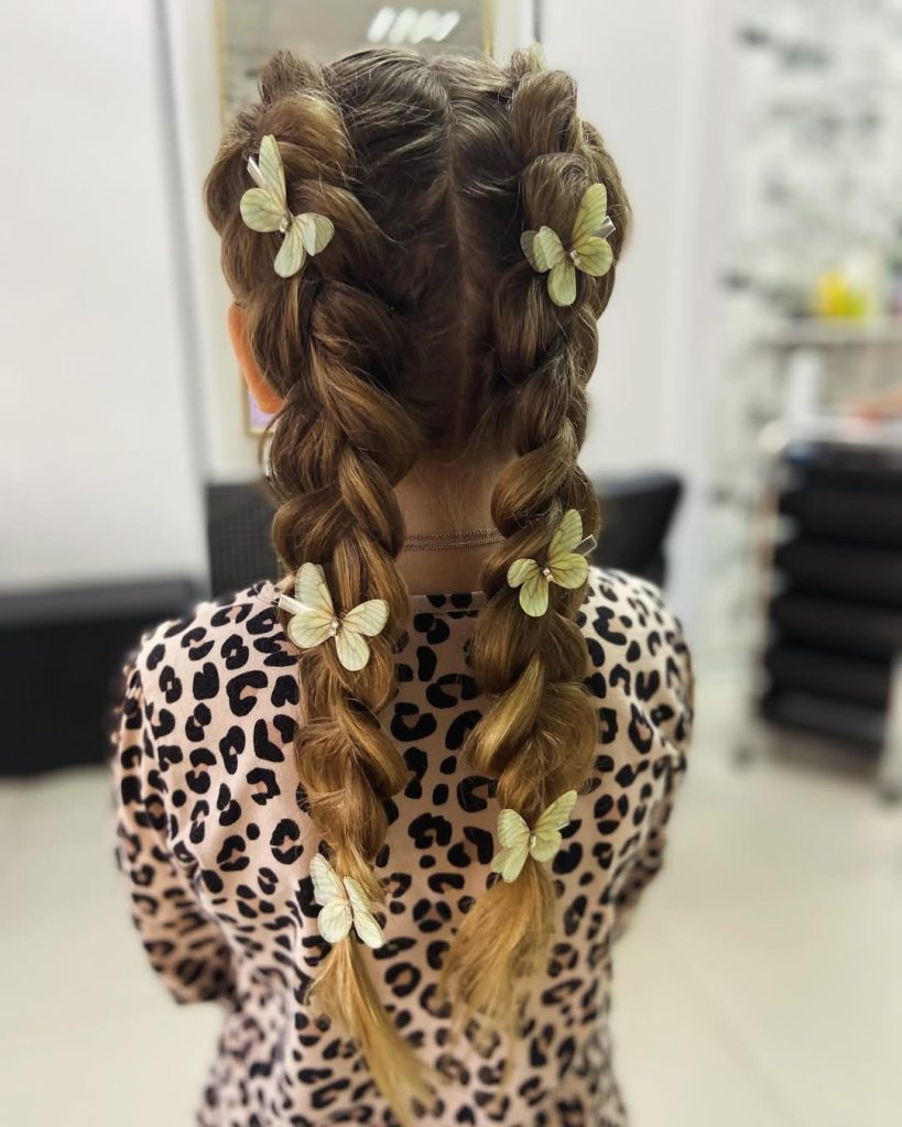 Soft, full braids decorated with delicate butterflies just feel like spring magic. This hairstyle has that dreamy, whimsical quality—like she just wandered out of a garden. The braids are structured, but the butterfly clips add a light, playful touch that makes the whole thing look airy and adorable for Easter gatherings.
