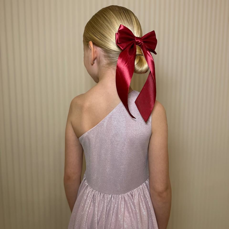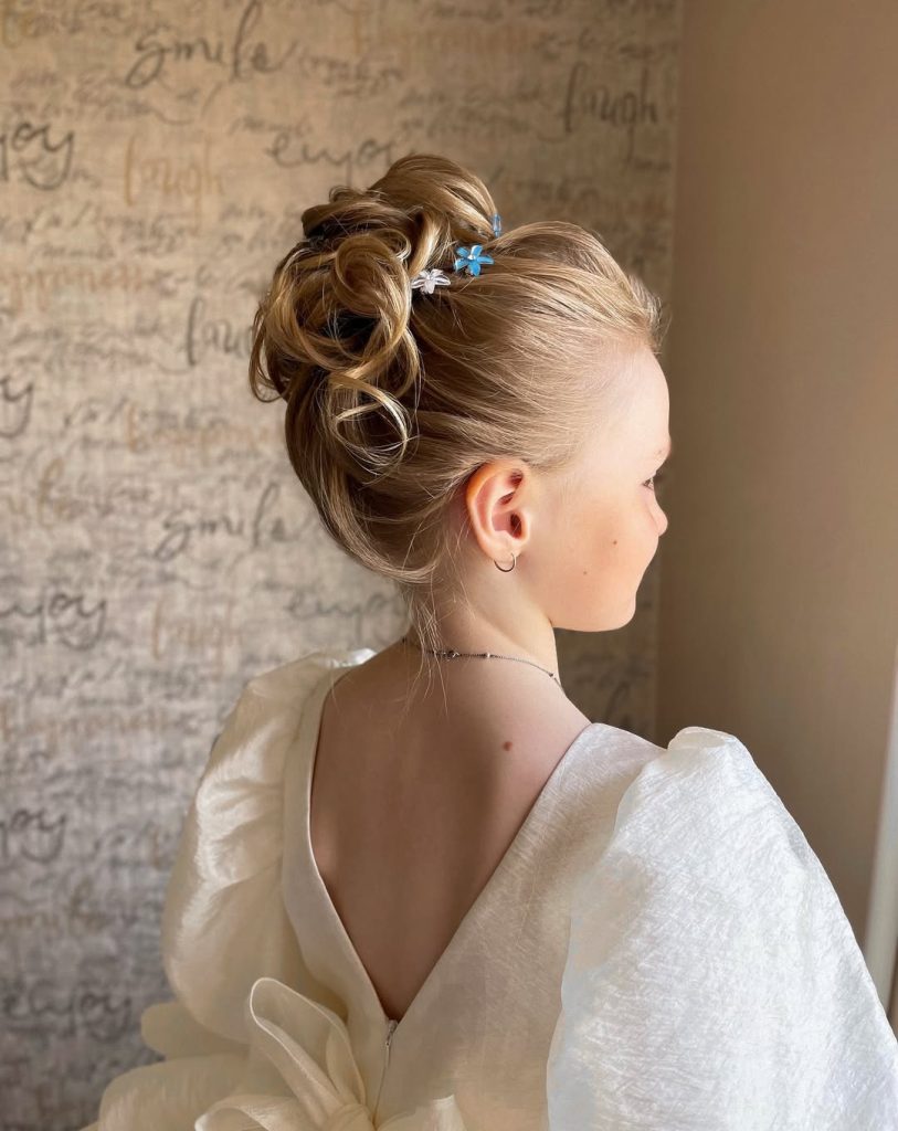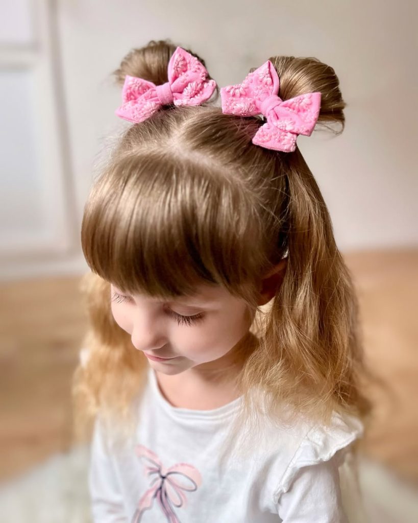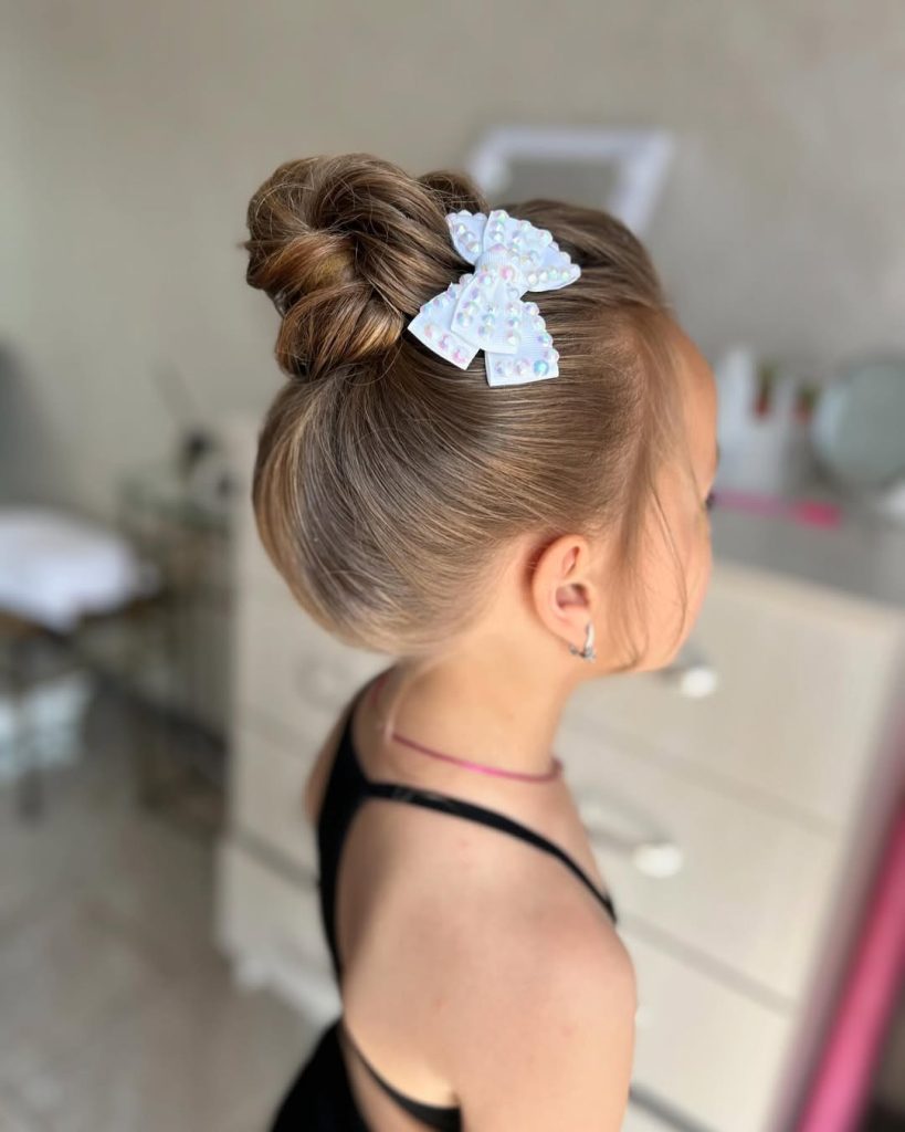 This high bun finished with a large pastel bow feels classic and elegant. The smooth, glossy finish gives it a refined edge, while the bow keeps it youthful and Cute. It’s one of those styles that instantly makes a little girl look put together and photo-ready without feeling too grown up.