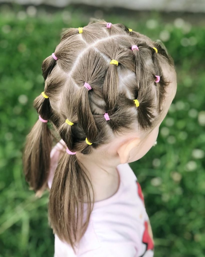 The playful crisscross pattern on her head evokes a sense of celebration. The tiny sections tied with bright elastics create a fun, springtime energy—almost like a basket woven from hair. It’s Cute without being fussy, and those pops of color instantly make it feel Easter-ready, especially when she’s running around collecting Eggs.