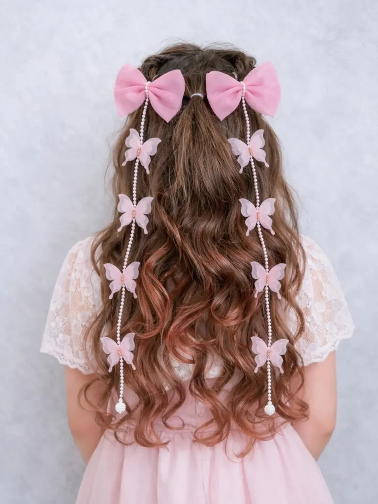 This hairstyle exudes an enchanting aura. The soft curls cascading down the back combined with delicate butterfly accents create such a magical, springtime look. The pearl strands woven into the half-up, half-down style add an extra layer of charm, making the hairstyle feel dreamy and undeniably cute.