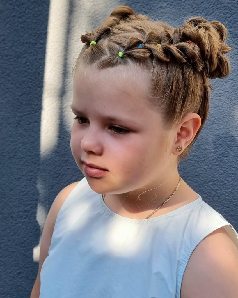 Wouldn’t you agree that this resembles the hairstyle version of bunny ears? The braided sections sweeping back into two little buns feel whimsical and just a bit magical. It’s the kind of Cute updo that makes a little girl stand taller because she knows she looks special. This hairstyle is perfect for Easter photos, as it balances sweetness and structure in the loveliest way.