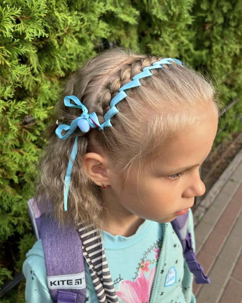There’s something so charming about weaving ribbon into a braid. The soft blue accent feels delicate and springy, almost like it belongs next to pastel Eggs and fresh flowers. The Headband effect keeps everything neat while still letting her length show, and the little bow at the side adds that extra Easter touch without going overboard.