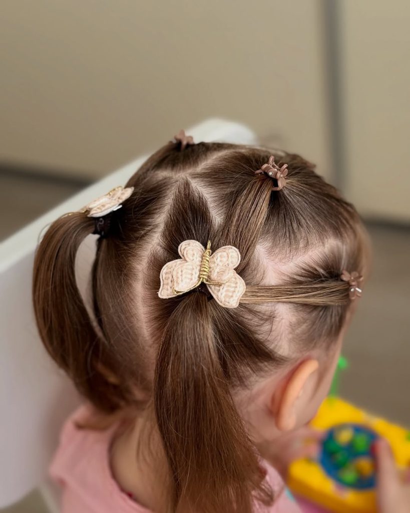 This style simply captivates me. The little sectioned Ponytails combined with soft butterfly clips feel playful and sweet—like spring itself tucked into her hair. It has that cute, slightly vintage vibe that makes you want to pull out a pastel dress and weave a basket for the big egg hunt. It’s polished, but it is still very kid-friendly.
