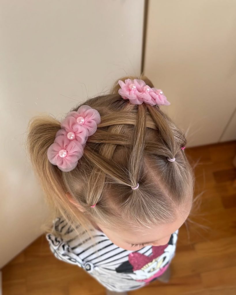 This style embodies the essence of spring blossoming directly on her head. The soft crisscross pattern leading to tiny Ponytails is already adorable, but those delicate pink flowers with little pearl centers make them extra Cute for Easter. It has that sweet, dressed-up feel without looking too grown-up. I can just imagine her holding a Basket, proudly showing off her hair before heading out to find Eggs in the backyard.