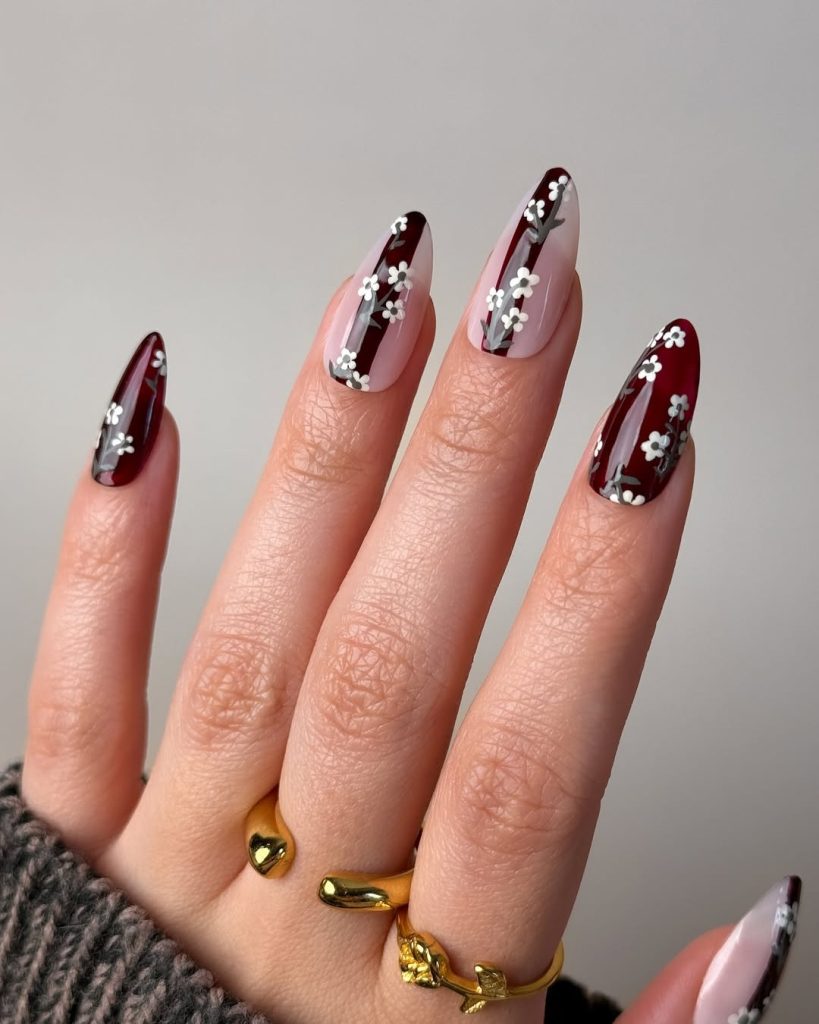 This set blends deep burgundy with delicate white floral Art over a sheer base, and the result is romantic without being overly sweet. The contrast between the rich Red tips and the soft floral Designs creates dimension and movement. It feels like spring blooming through darker tones—exactly the kind of Inspo that defines dark spring nails 2026.