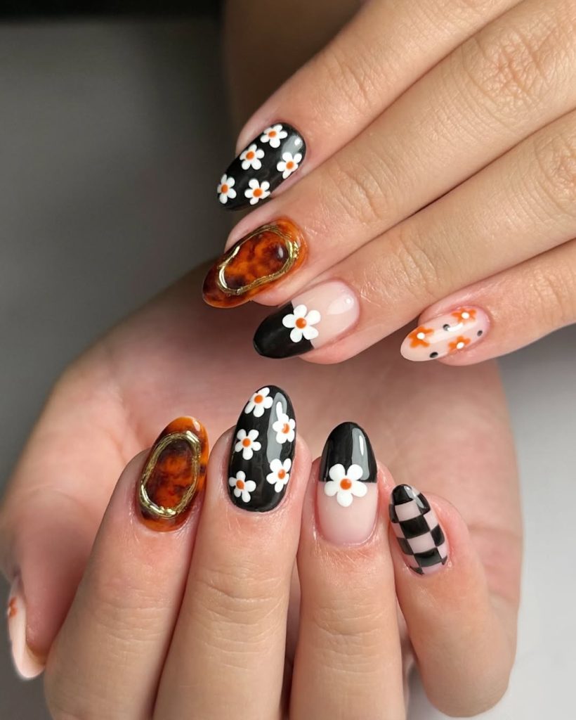 This set feels like a little gallery on your fingertips. A mix of black French tips, daisy art, tortoiseshell design, and even a playful checker detail makes it one of the most creative dark spring nail ideas of 2026 so far. The contrast between deep, Solid black and warm amber tones adds richness, while the tiny white flowers make it Cute and unexpectedly fresh for 2026.
