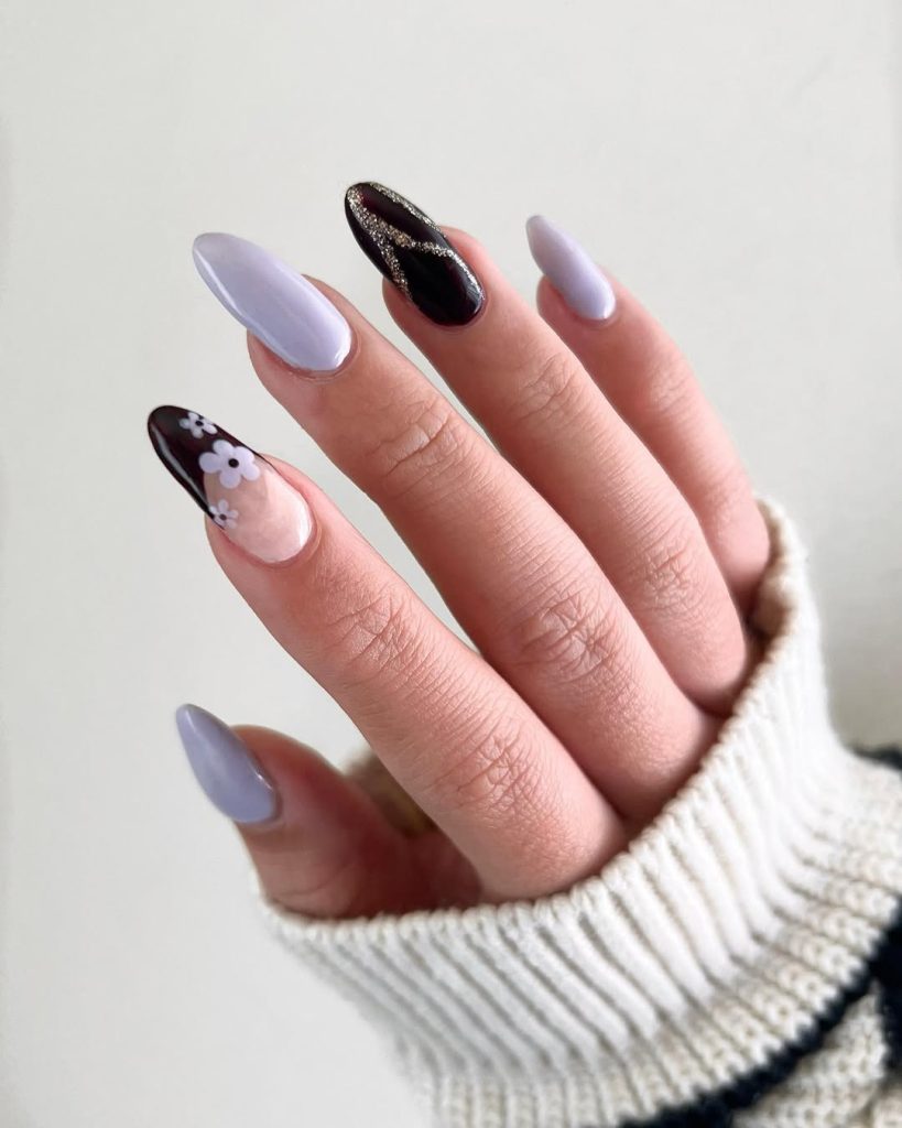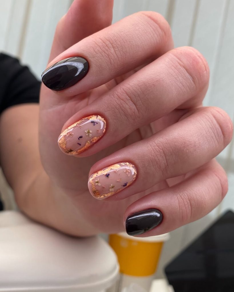 There’s something so elegant about pairing deep black with soft nude and delicate gold foil. These short nails combine solid dark polish with translucent bases that feature tiny floral art and gold accents. The effect is refined and feminine, with just enough shimmer to catch the light. This design offers a sophisticated interpretation of dark spring nails for 2026, exuding a grown-up and graceful vibe.