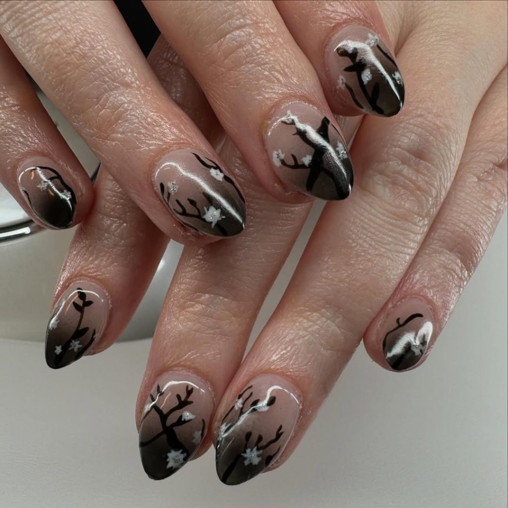 This smoky ombre fades from soft nude to deep black, creating a mysterious backdrop for delicate branch Art. The tiny white blossoms almost glow against the dark gradient, giving a subtle Glow in effect. It’s romantic yet Moody, like spring just beginning to bloom after a long winter. Among dark spring nails 2026 Ideas, this one feels poetic and slightly dramatic.