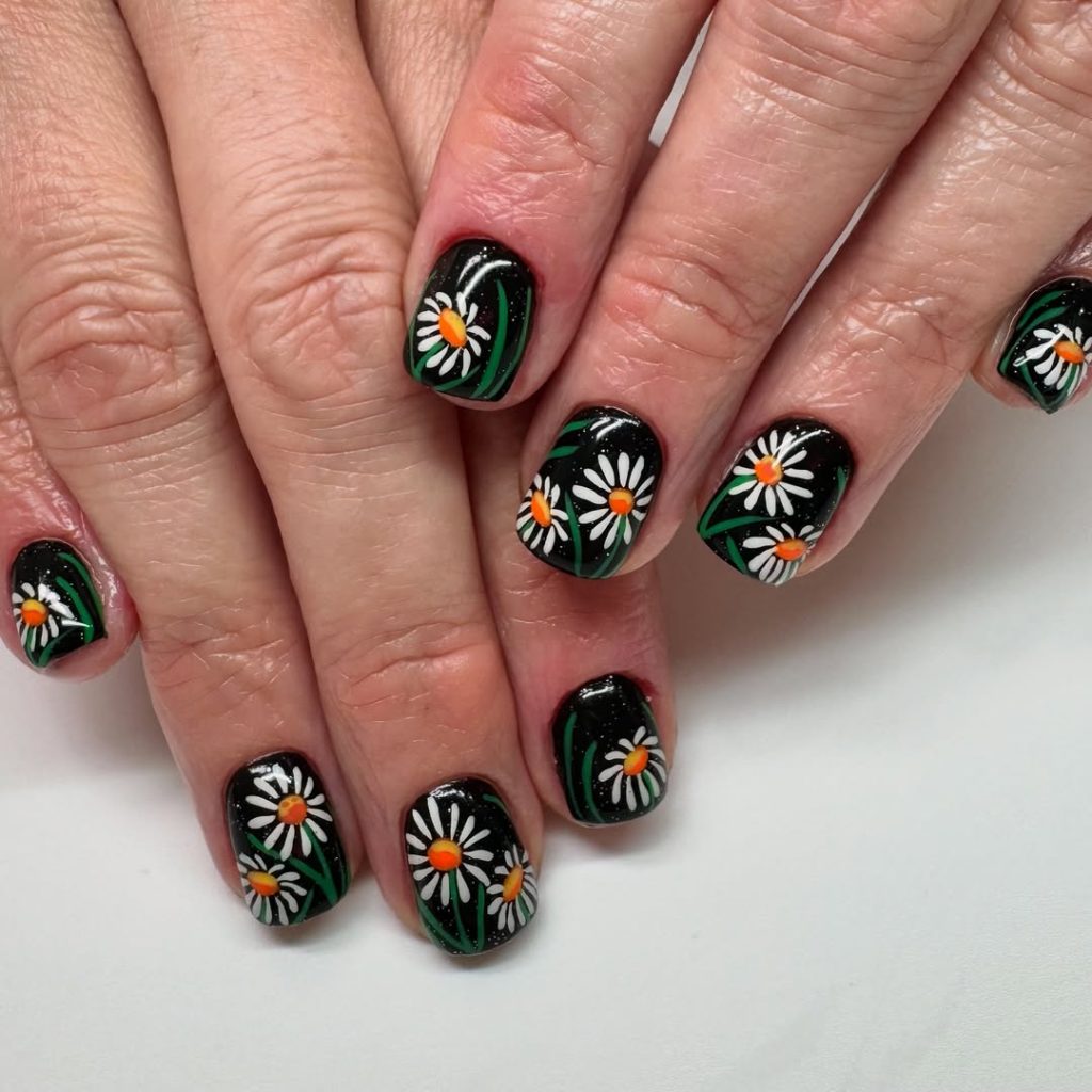 These short black nails, covered in cheerful daisy art, feel playful but still grounded in dark tones. The deep Solid base makes the white petals and bright centers pop, while subtle green leaves add fresh spring energy. It’s Cute, lively, and a little nostalgic—like daisies painted against a midnight sky. For dark spring nails in 2026, this manicure is joyful yet still Moody.