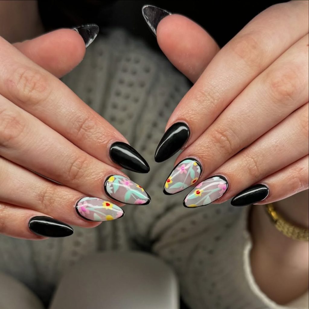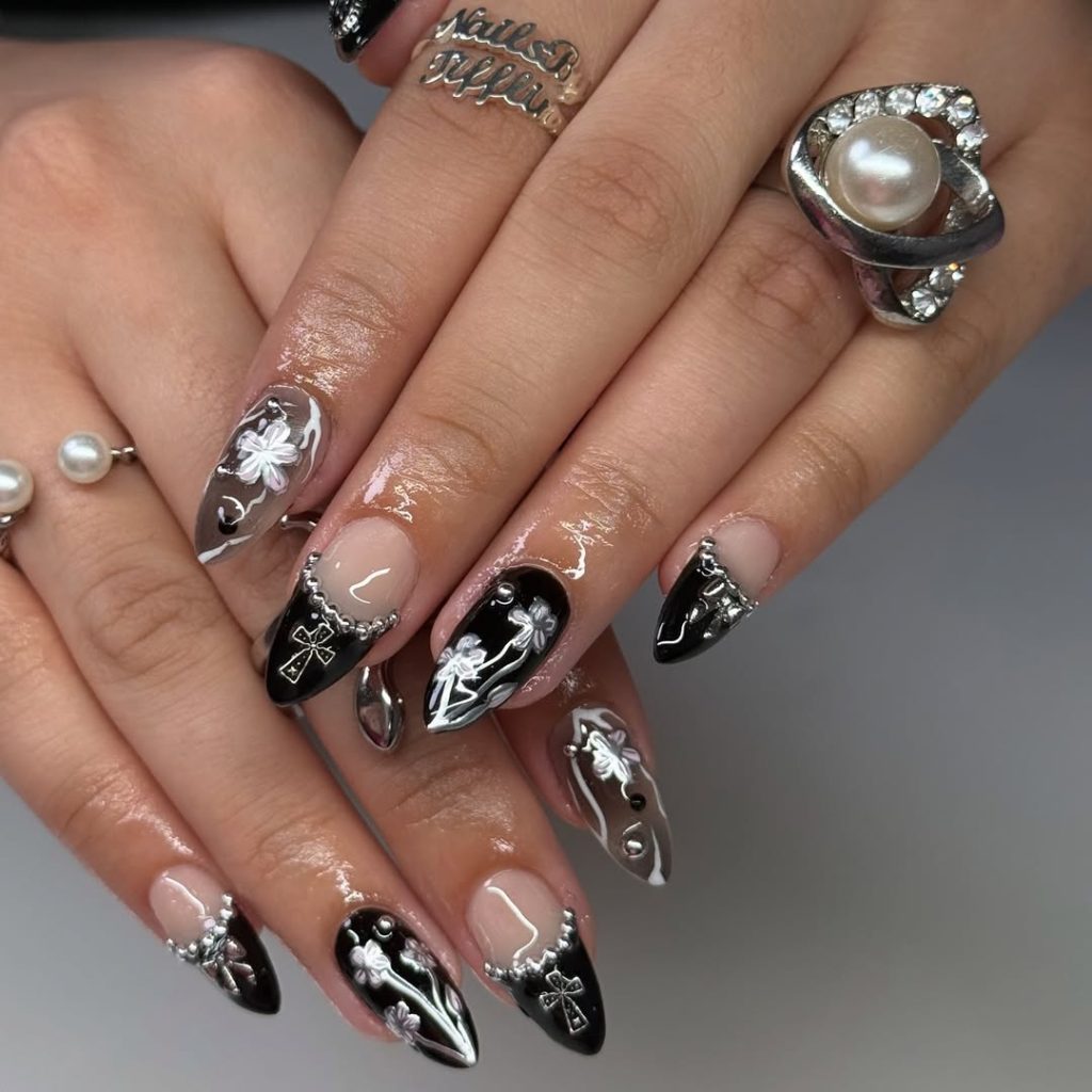 This set feels intricate and meaningful, almost like wearable jewelry. The combination of black tips, nude bases, metallic accents, and delicate floral Art creates depth and personality. It’s dramatic but thoughtfully composed, making it one of the most detailed dark spring nail 2026 Designs in this collection.