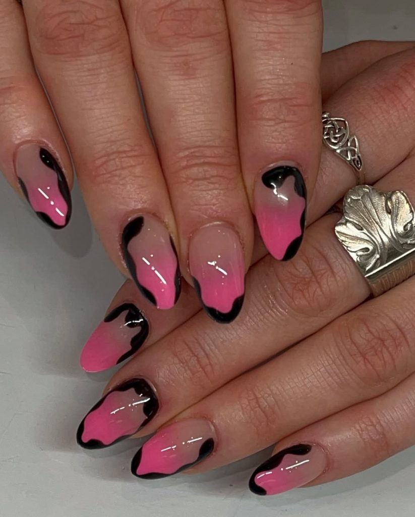 This playful pink ombre melting into black edges feels like a sunset with attitude. The glossy finish enhances the gradient effect, while the irregular dark outline adds a modern twist. It’s Cute, bold, and slightly rebellious—proof that dark spring nails in 2026 can still embrace vibrant Colors.