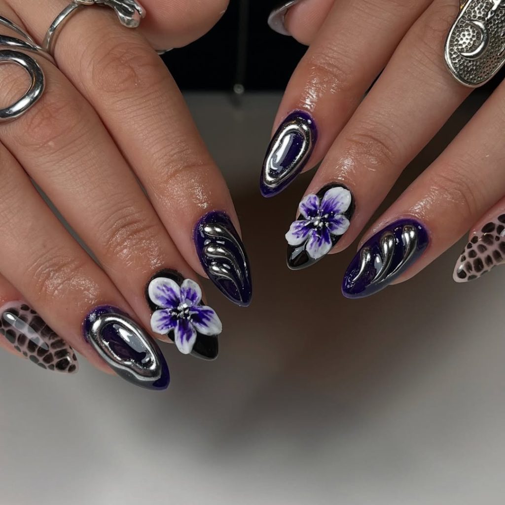 Deep purple paired with reflective Chrome accents creates a luxurious, almost cosmic effect. The raised floral Art adds dimension and texture, turning each nail into a tiny sculpture. It’s rich, dramatic, and unapologetically bold—exactly the type of dark spring nails for 2026 that make a statement.