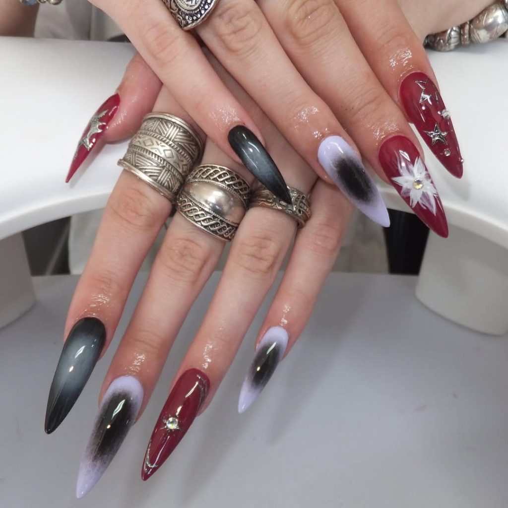 This set feels like a dramatic spring evening wrapped around your fingertips. The mix of deep Red, smoky ombre fades, and subtle rhinestone accents creates a layered, almost mystical mood. The elongated stiletto shape adds intensity, and the combination of dark and soft tones makes these dark spring nails for 2026 feel rich and expressive rather than heavy.