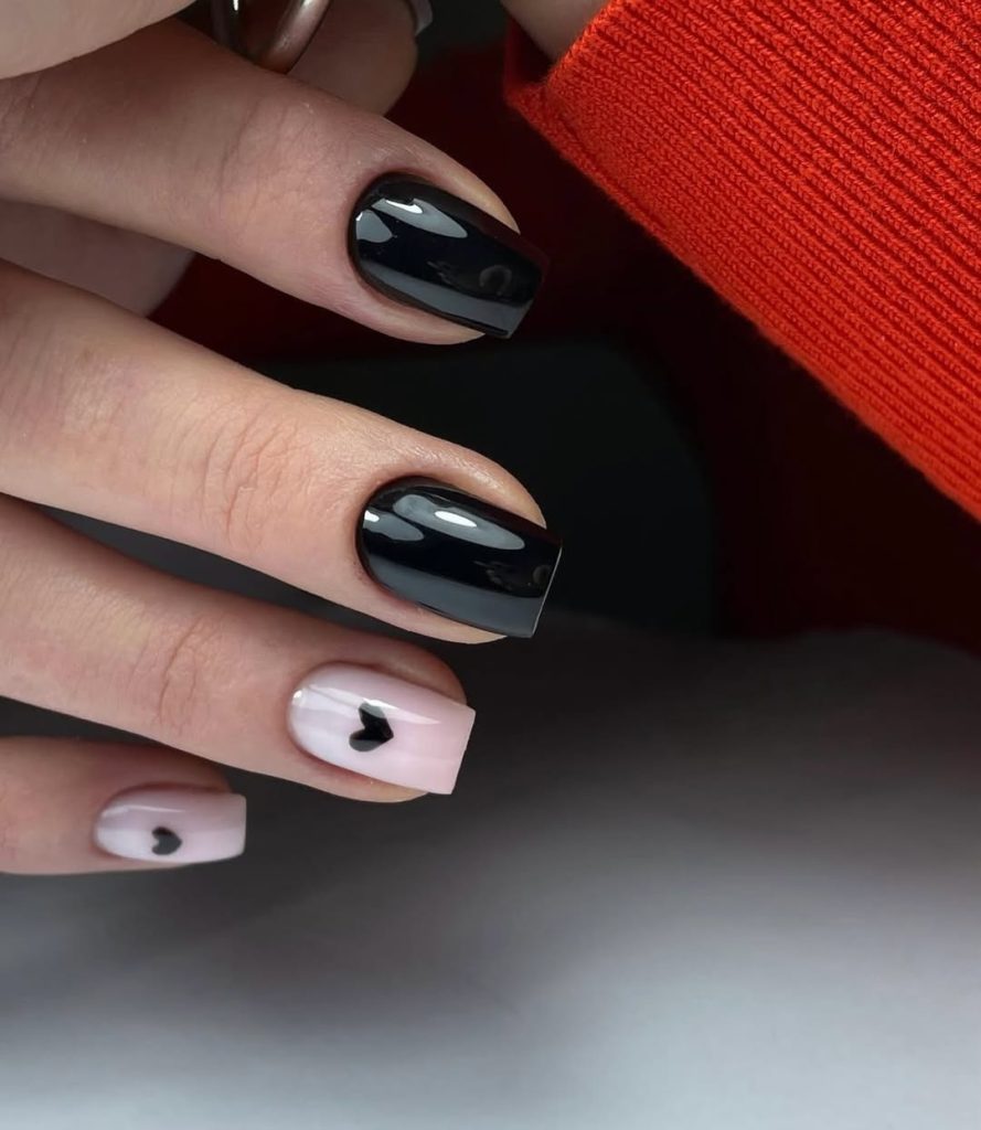This playful combination of glossy black and soft nude, featuring tiny heart art, feels sweet yet modern. The crisp square shape adds structure, while the small heart details keep it cute and subtle. It’s a charming take on dark spring nails 2026 that balances romance and edge.