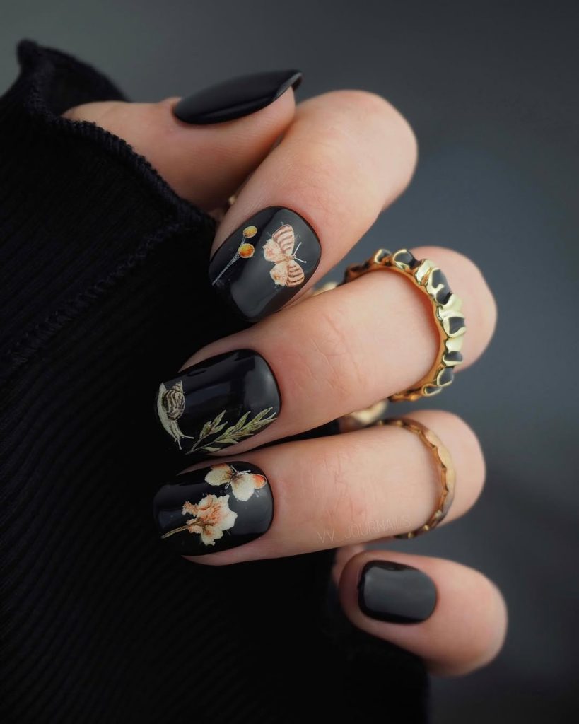 There’s something undeniably chic about black in spring—especially when it’s softened with delicate botanical details. These Short Matte black nails feel sophisticated and slightly mysterious, like a leather jacket thrown over a floral dress. The tiny butterflies and floral artwork elevate the solid base into something truly special. These nails represent the most refined version of dark spring nails for 2026.
