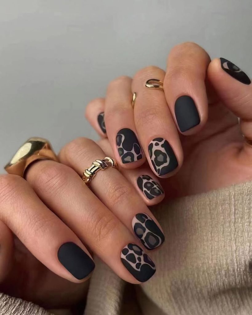Animal print in spring? Absolutely—especially when it’s done in deep charcoal with a soft nude base. These Short Matte nails feel bold but wearable, like your favorite neutral coat with a little wild edge. The combination of solid dark tones and leopard art creates the perfectly moody vibe that defines dark spring nails for 2026. It’s edgy without screaming, stylish without trying too hard.