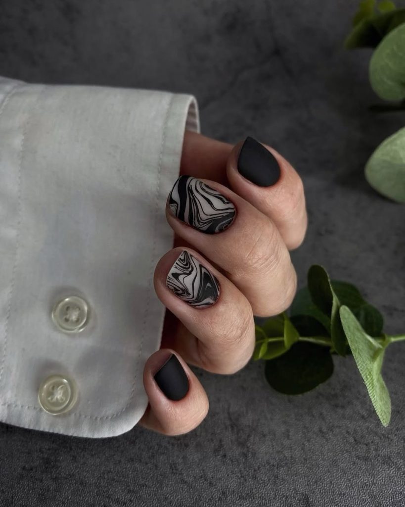 There’s something hypnotic about black and white marble. The swirling art over a pale base, paired with matte black accent nails, feels almost architectural. It’s clean, graphic, and undeniably chic. Among dark spring nails 2026 Designs, this one leans into contrast and texture rather than Color, and that restraint is what makes it so striking.