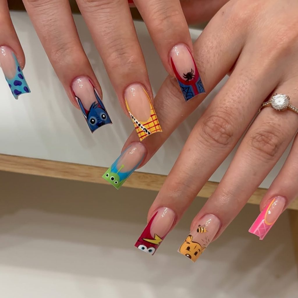 These nail designs are way too long and square to not be a dream for anyone who loves bold acrylics. The characters are painted in vivid colors all set to pop wonderfully, making it a nice inspo idea for summer or any occasion where you want your nails to be the star accessory. Fun, colorful, and oozing personality, these nails must-have designs for any Pixar fan.