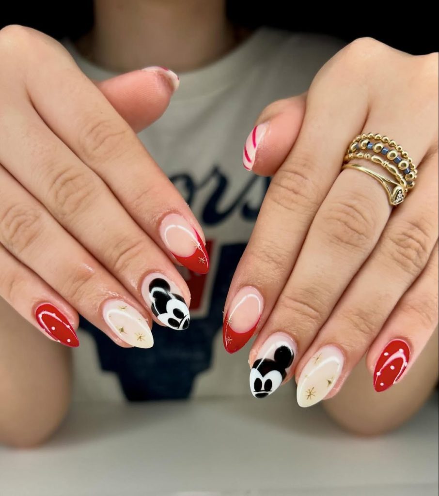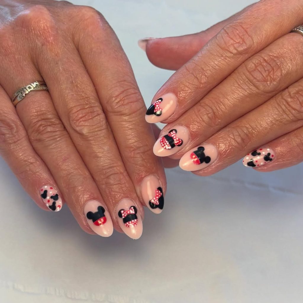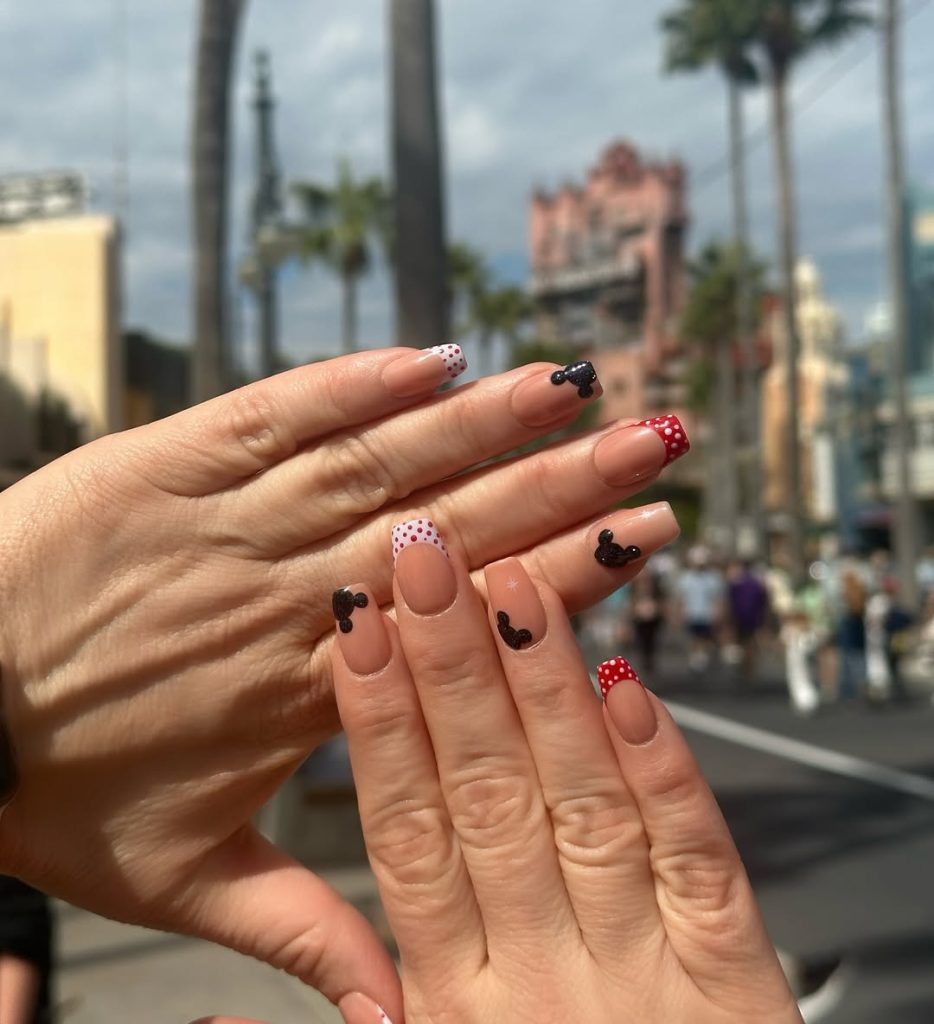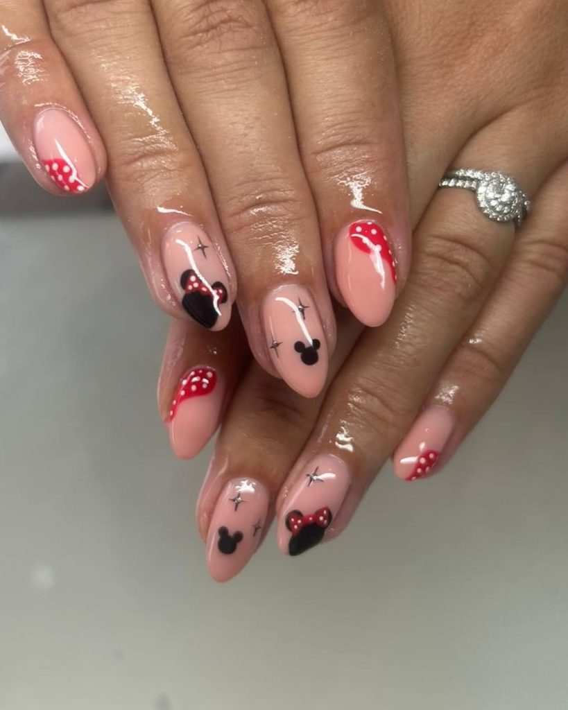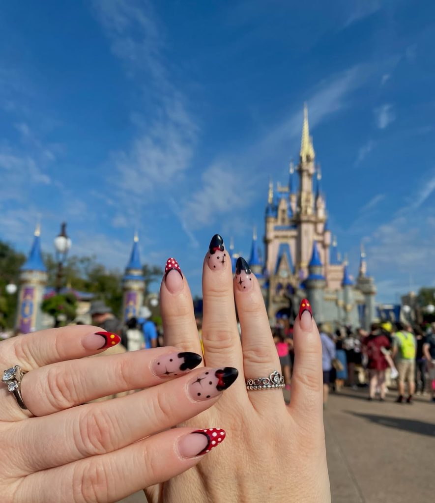 For something soft and understated, these choices hit the dreamy note. Black Mickey heads are scattered across the nails with red dots against a pastel nude background for an almost delicate, festive allure. Given its subtleness, it is an inside reference to one’s Disney love, only recognized by those who notice the finer details.