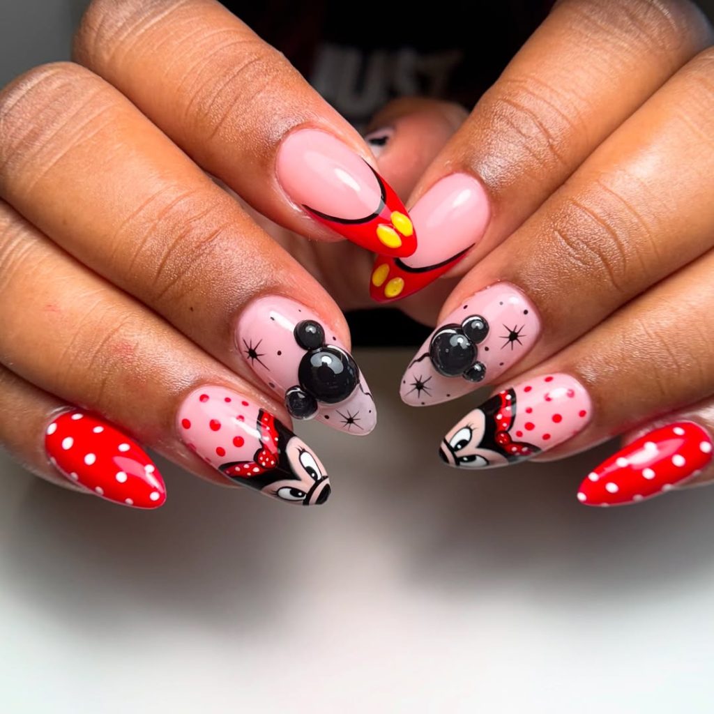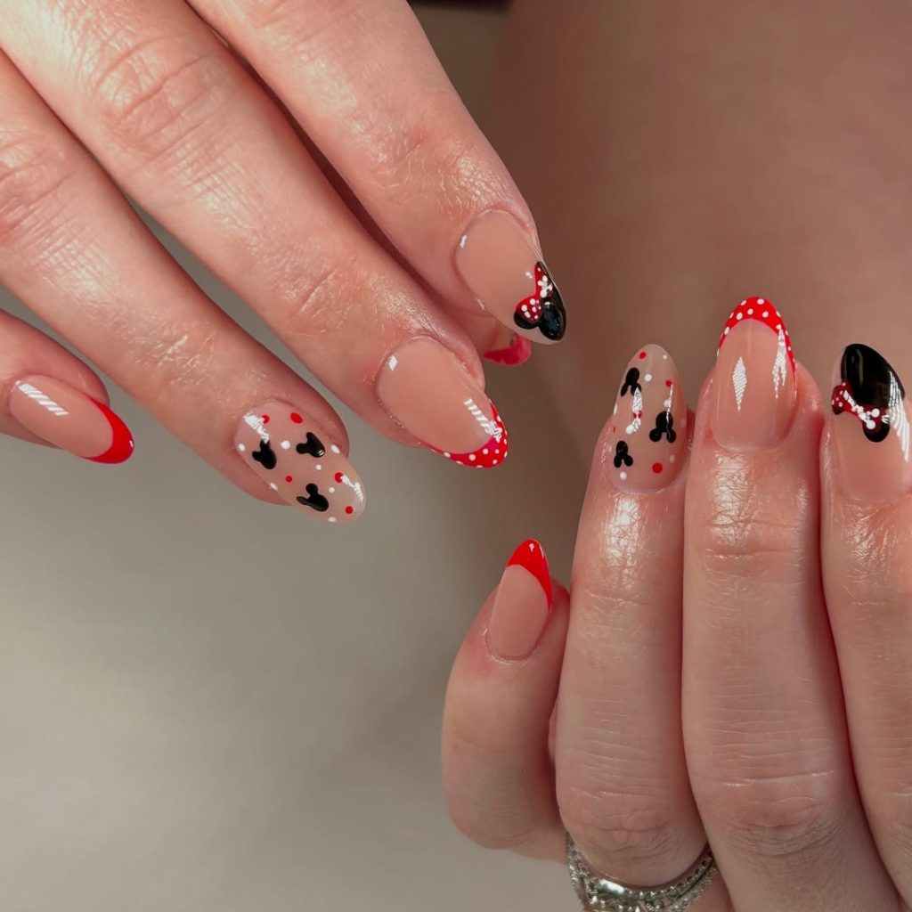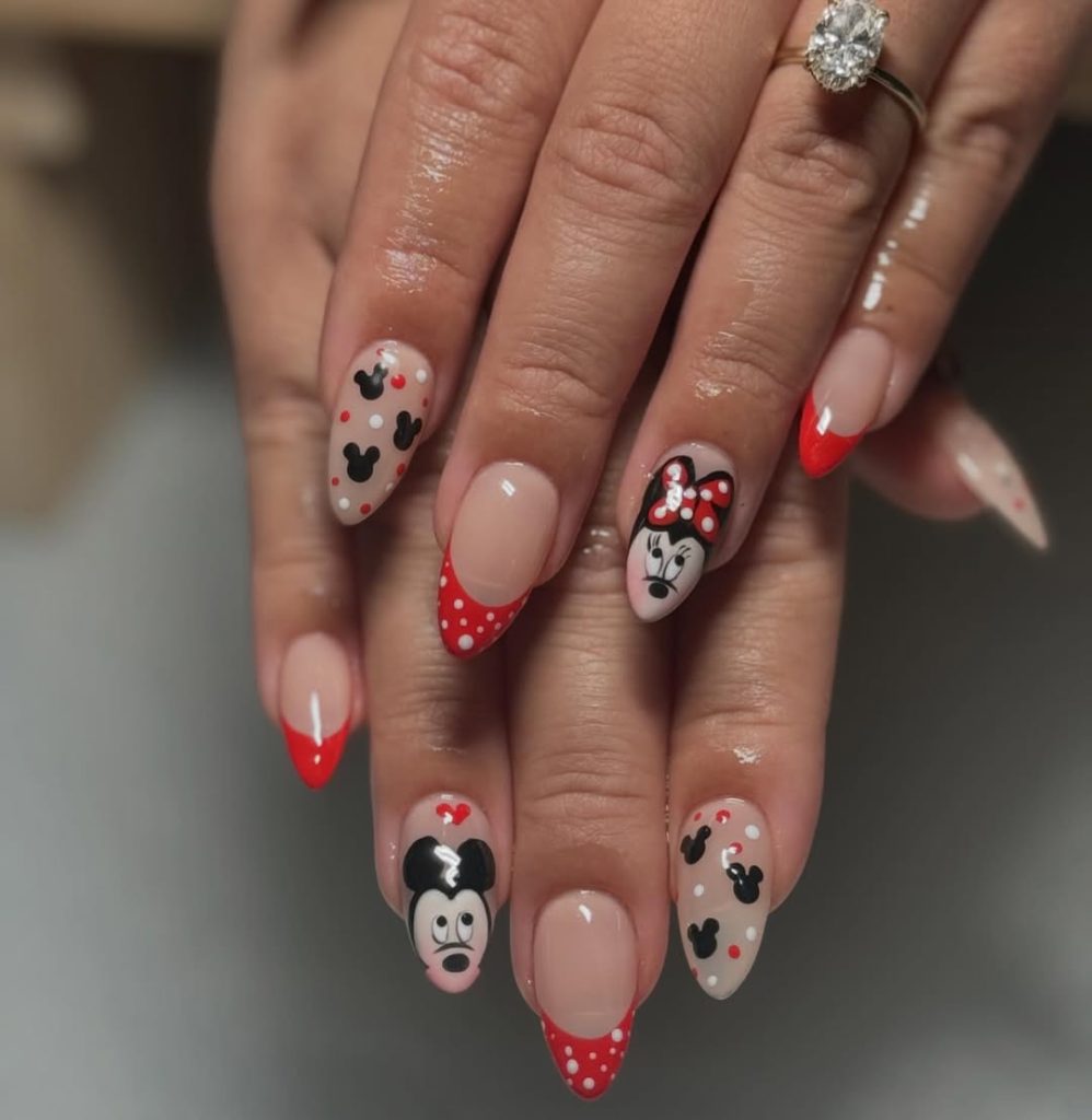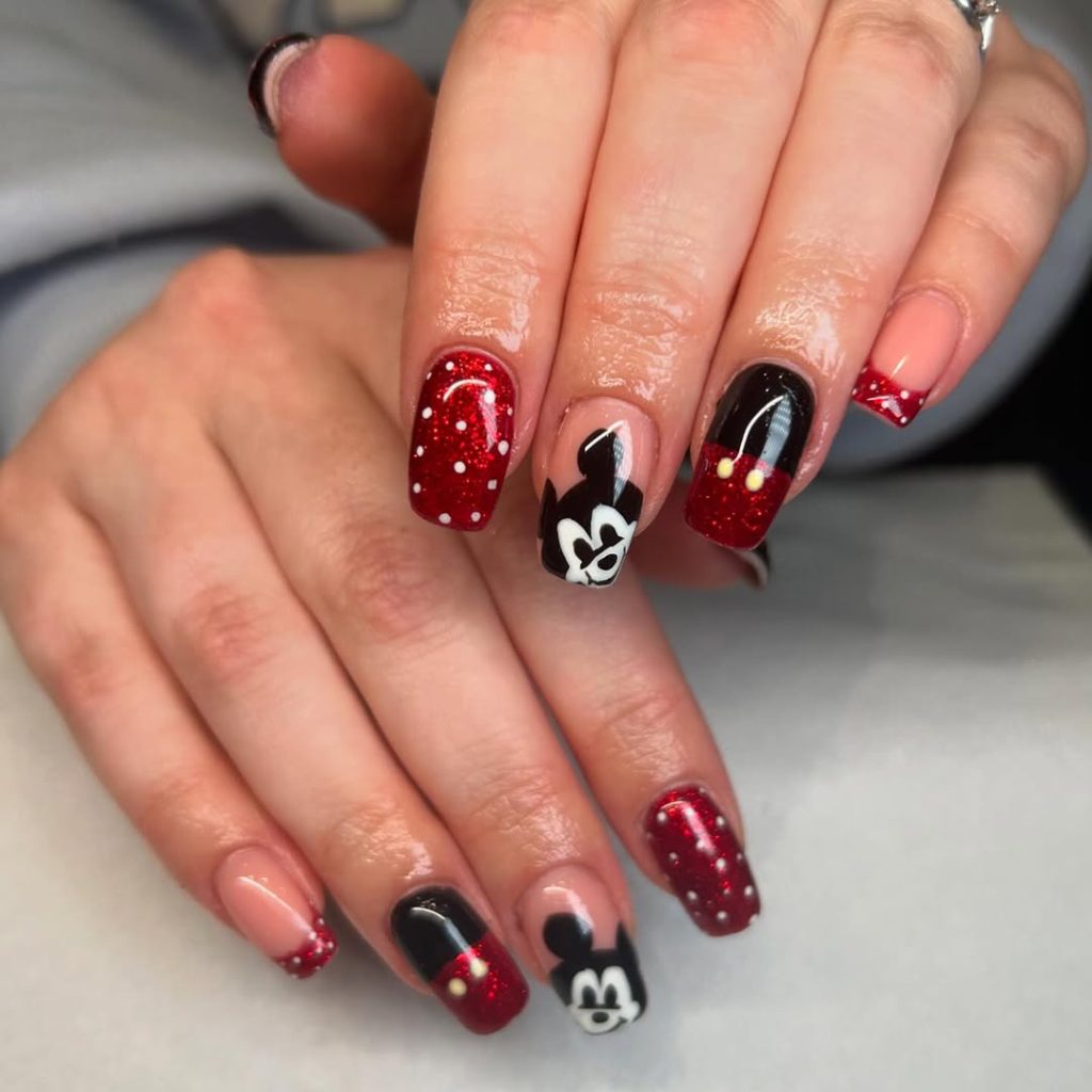 For something soft and understated, these choices hit the dreamy note. Black Mickey heads are scattered across the nails with red dots against a pastel nude background for an almost delicate, festive allure. Given its subtleness, it is an inside reference to one’s Disney love, only recognized by those who notice the finer details.