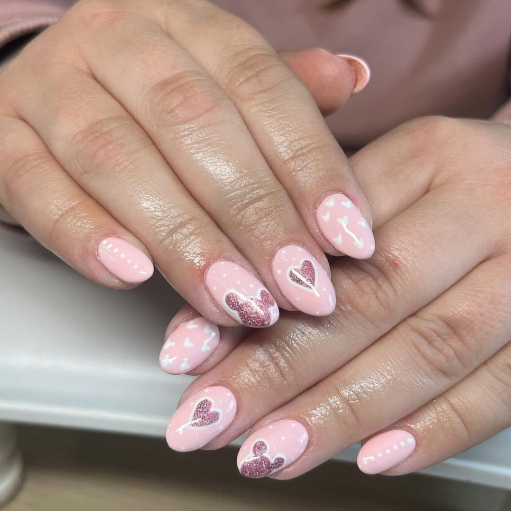 Soft pink nails with glittery Mickey silhouettes and heart accents bring a romantic twist to disney nails 2026. The design feels dreamy, as if stepping into a pastel fairytale, and just the right amount of sparkle to catch the light. Cute shapes and subtle tones make this style girly and accomplished-a perfect way to show your love of Disney in a mature way.