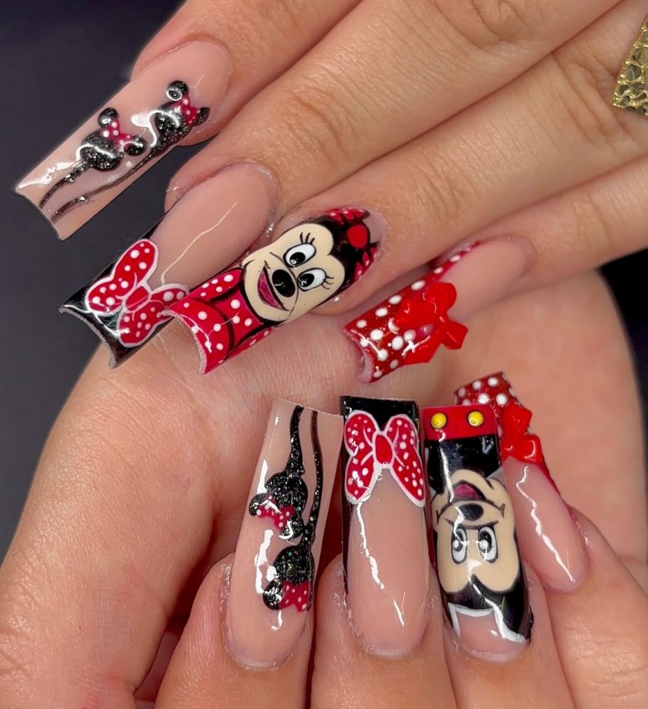 6. Bold Minnie and Mickey Character Nails