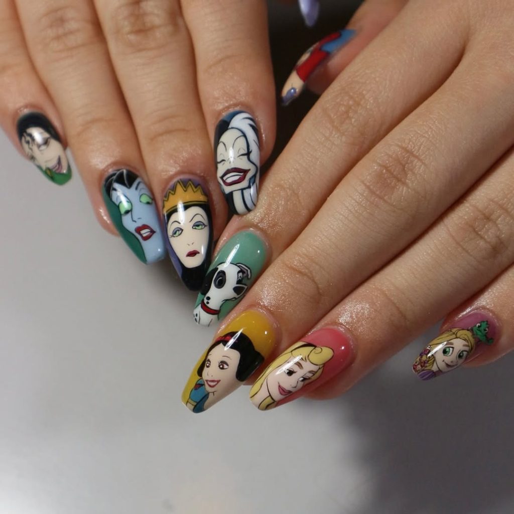 These nails are low-maintenance and super easy to sport every day, owing to their short round shape. Of course, the style lets you flaunt your love for Disney without any need for long acrylics, so it’s for those who enjoy the simple yet fun kinds of nail designs. Add a clear topcoat and bask in nails that are elegant and playful at the same time.