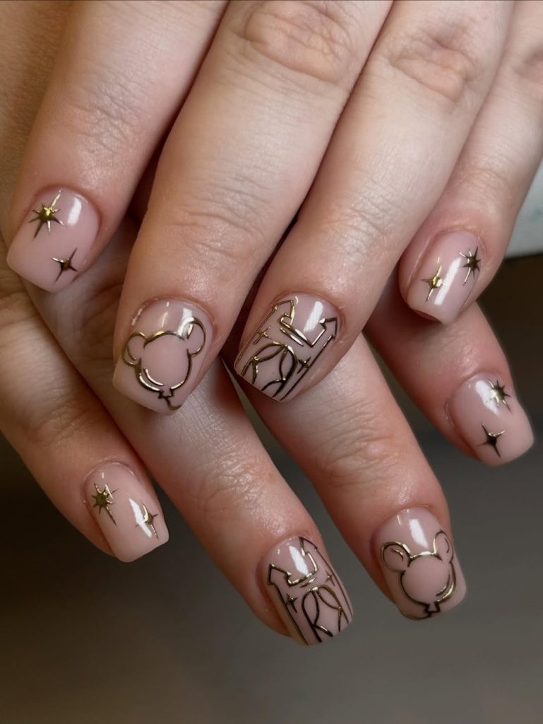 For a more subtle take on disney nails 2026, this design pairs nude polish with gold outlines of Mickey silhouettes, stars, and whimsical details. It’s a classy and understated way to show your love for Disney while keeping the look simple and neutral. These nails feel chic and modern, perfect for someone who prefers delicate touches over bold colors.
