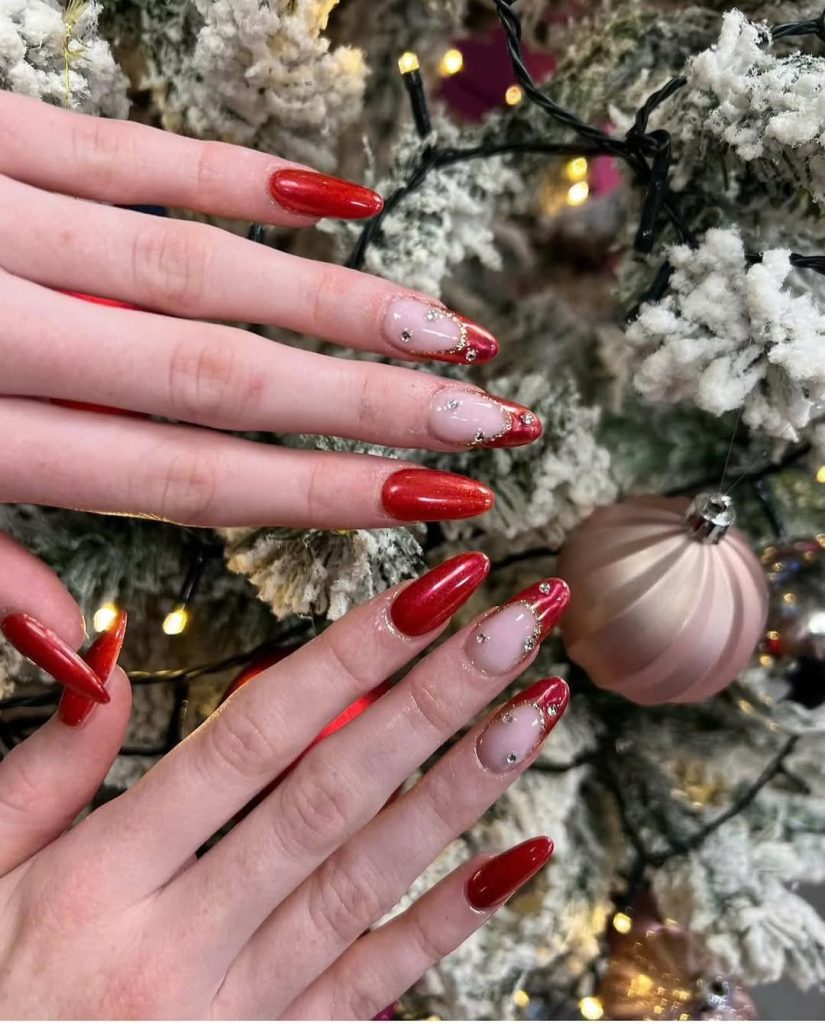 There’s something magical about deep red nails at Christmas — they instantly bring warmth, glamour, and that festive glow. This design mixes glossy red with clear accent nails detailed in gold chains and tiny crystals, creating a look that feels luxurious yet playful. It’s the kind of classy sparkle that catches the light every time you reach for a glass of champagne or place an ornament on the tree, perfect for anyone who loves traditions but still craves a modern twist.