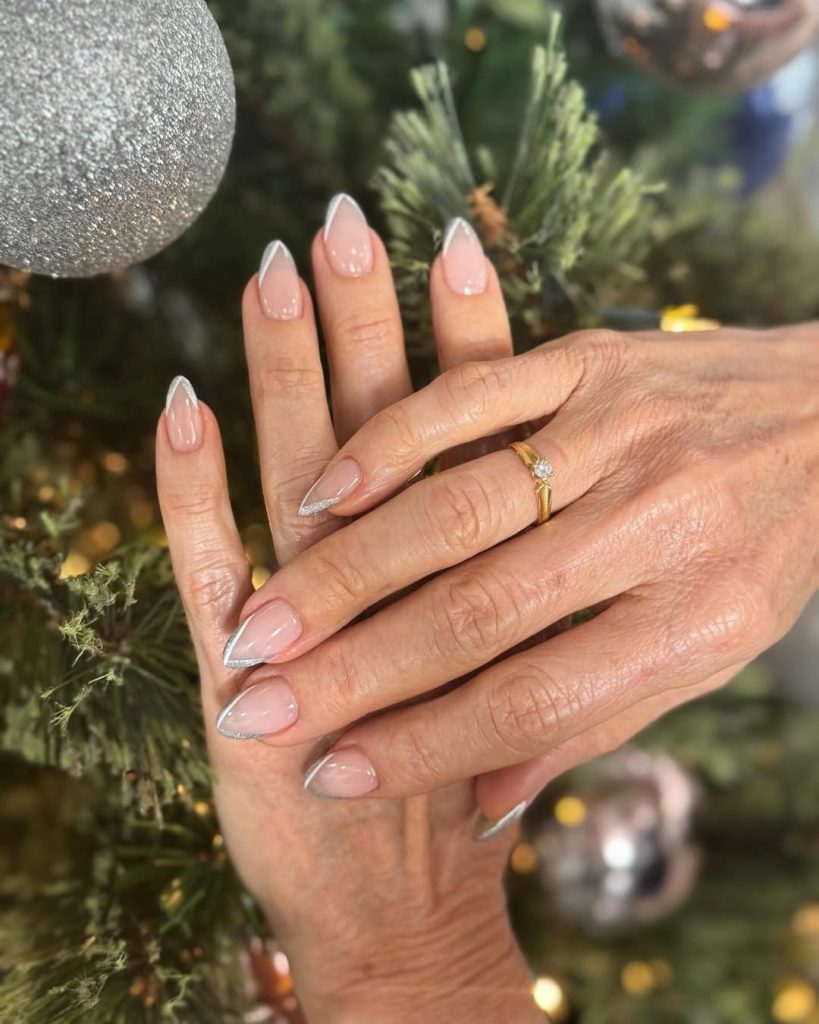 This manicure is best suited for almond shapes, ideal for anyone who wants a low-maintenance yet classy holiday design. The silver tips catch the light effortlessly and give off a winter white glow that complements gold jewelry or festive dresses. A perfect classy square alternative for those who lean towards softer lines and gentle sparkle.